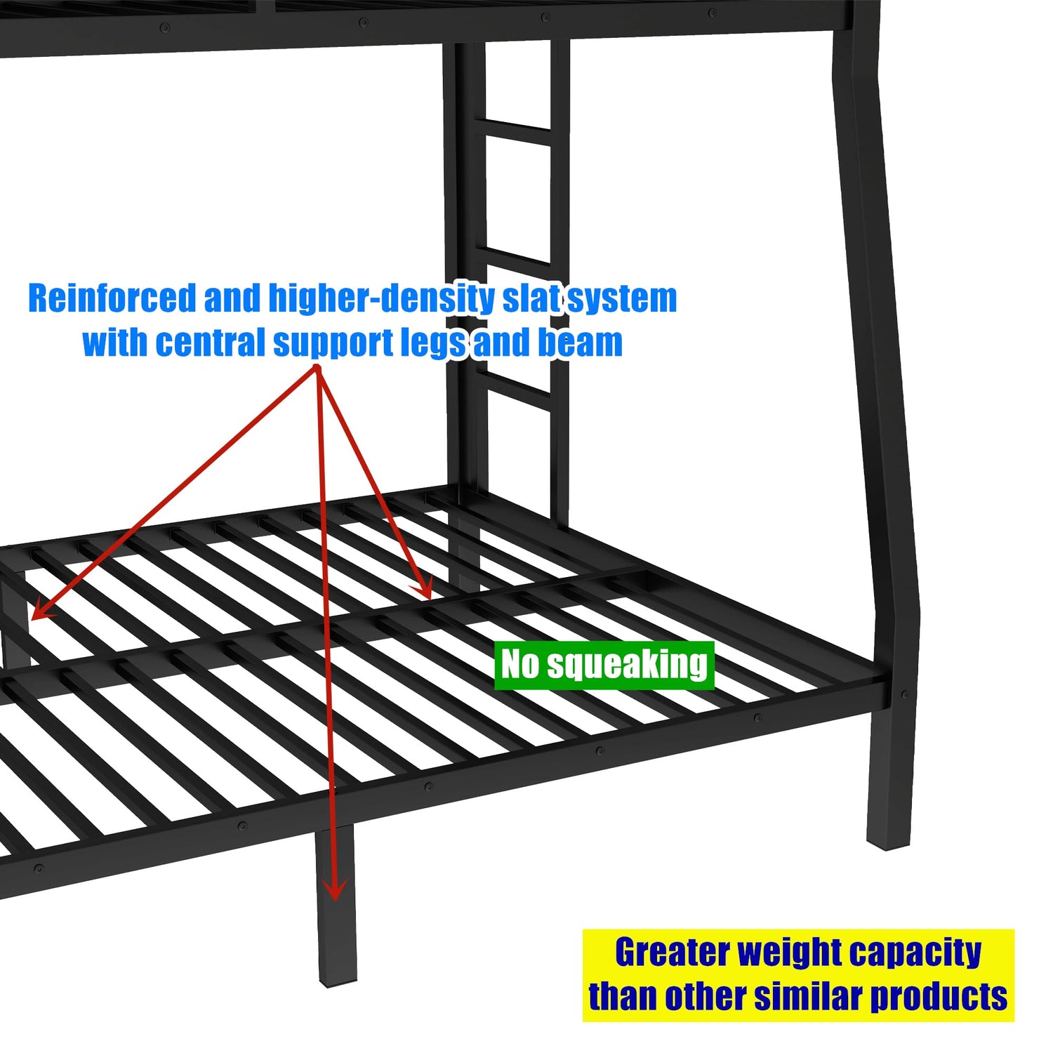 • 100% Greater weight capacity & more stable & more rust-proof --- Thickened metal frame and 4 central support legs and stronger iron bolts makes this bunk bed have greater weight capacity. Enhanced and stronger slats system. Greater weight capacity: Upper bed: at least 700 pounds; bottom bed: at least 800 pounds. Origin: Vietnam. Color: Black.