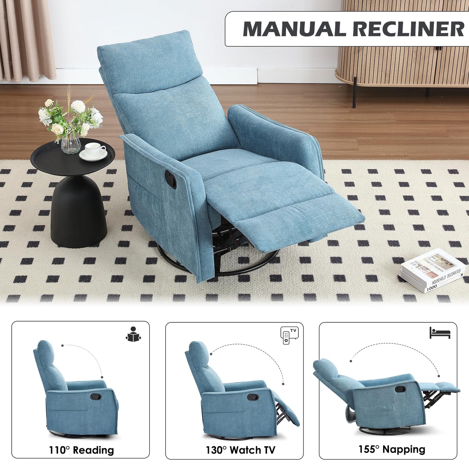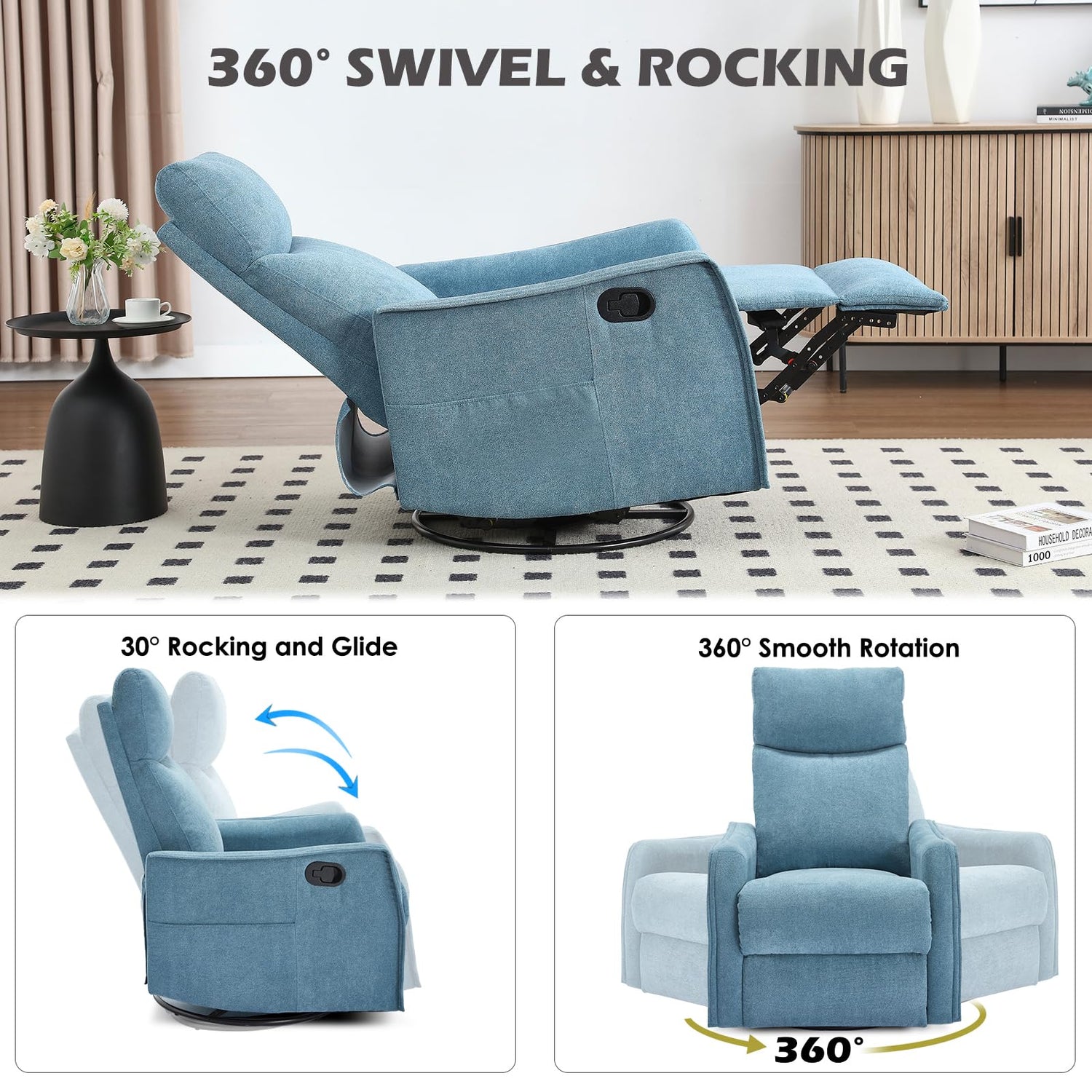 - 【Quality & Comfortable】- The swivel glider recliner is overstuffed with high-density sponge, which gives you a ultimate sense of softness. The manual swivel rocking chair is upholstered with high-quality chenille fabric, which is durable, breathable, quick-drying, and elegant, with a good touching. The metal frame base features a tipping-proof design, with a large load-bearing capacity up to 350lb, durable and secure enough to support a adult man.