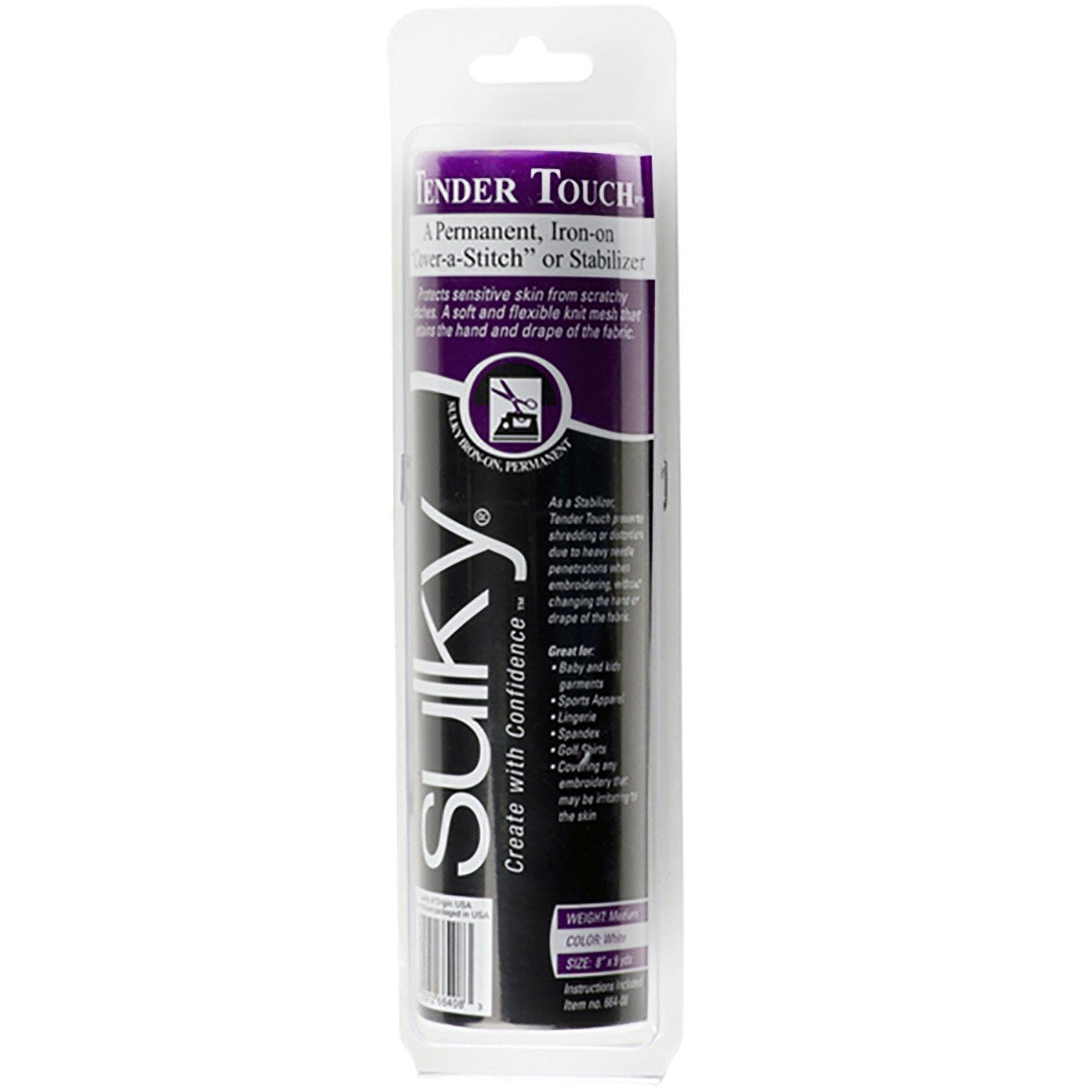 Details: Tender Touch is a lightweight, permanent stabilizer that is ideal to "cover-the-back" of finished computerized embroideries to protect sensitive skin from scratchy stitches. It is ideal for baby and child garments, sports apparel, lingerie, spandex and golf shirts because it stretches with the garment.