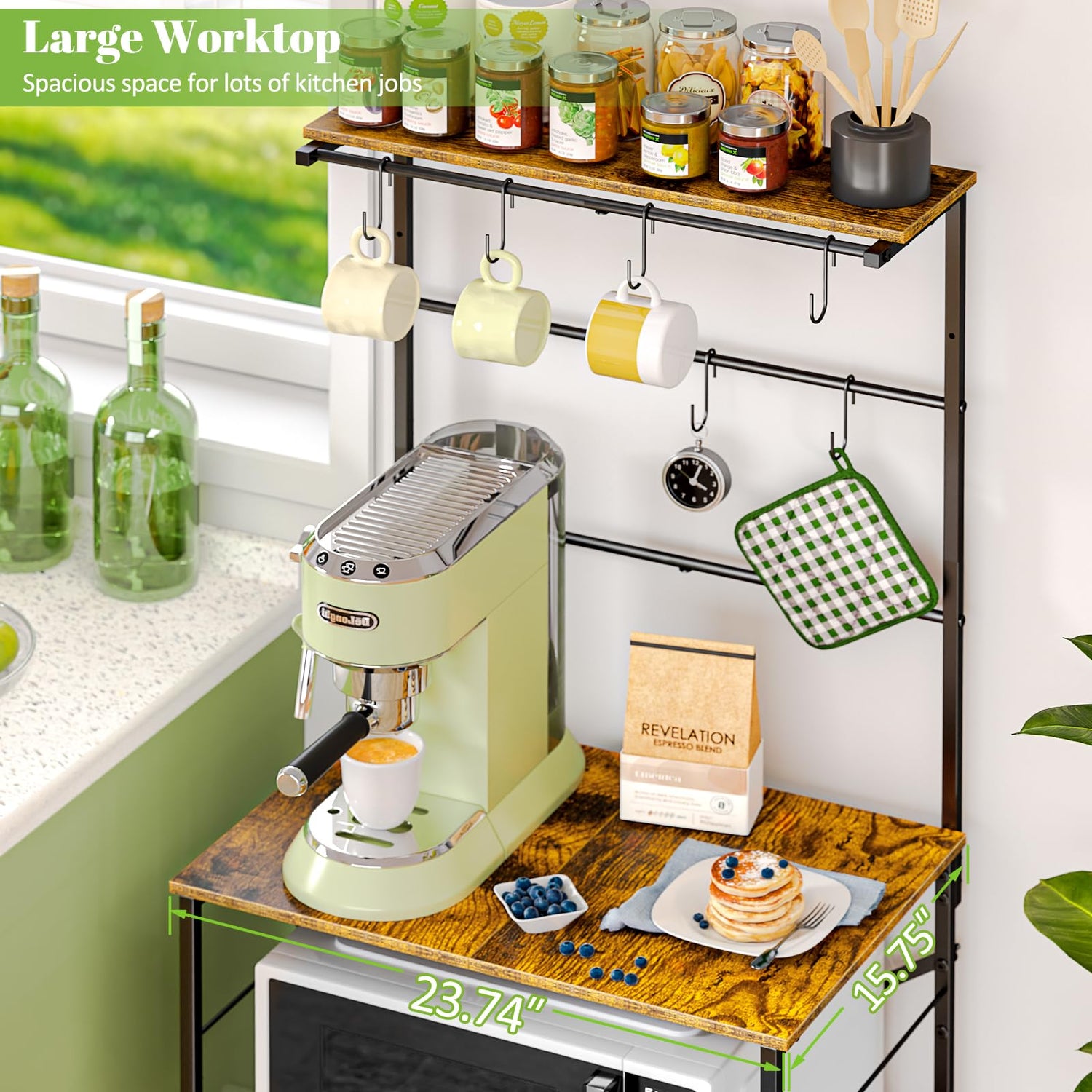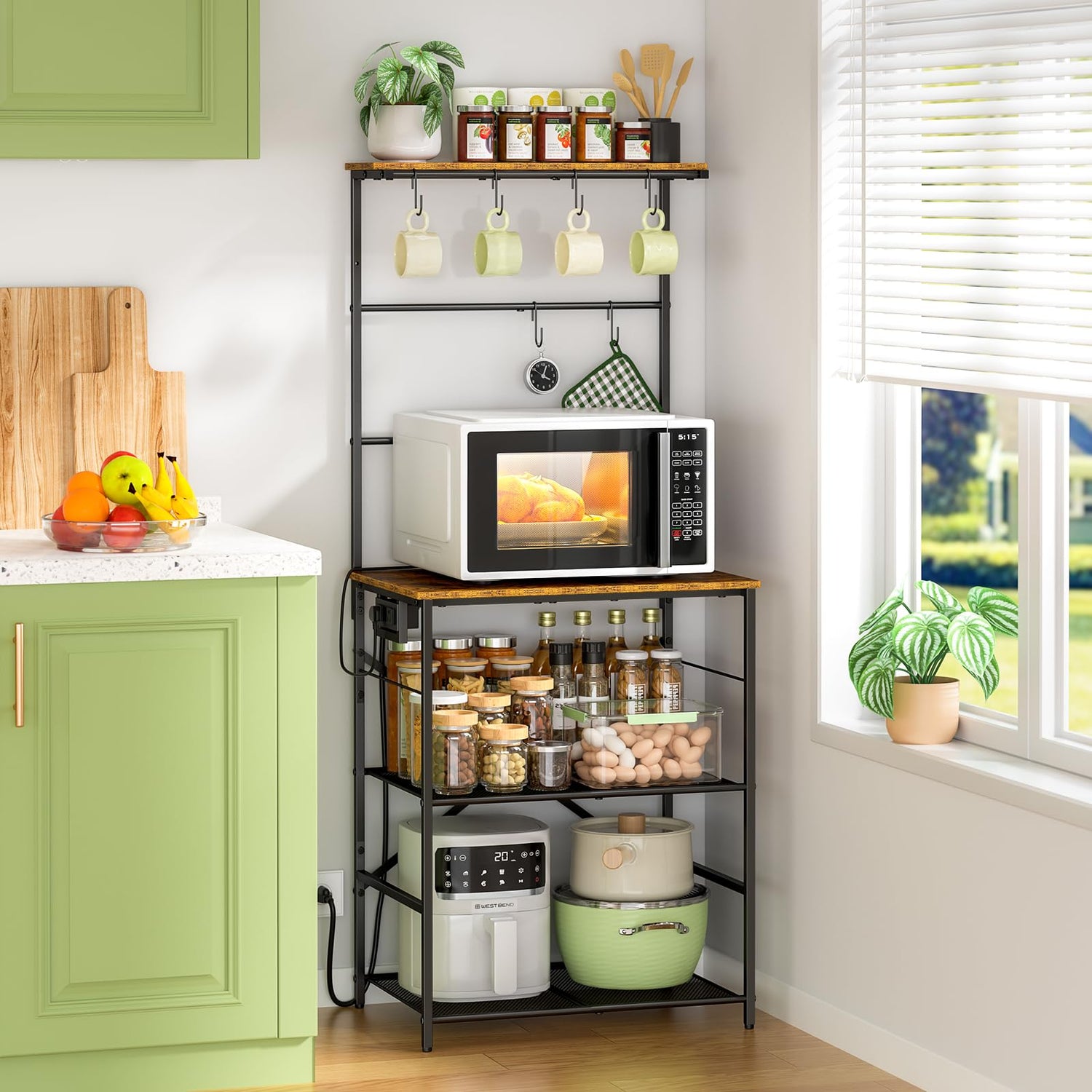 DAOUTIME Kitchen Bakers Rack with Power Outlet, 4-Tier Coffee Bar Station with 6 S Hooks, Microwave Stand for Kitchen, Living Room, Farmhouse, 23.62" W x 15.74" D x 57.13" H, Rustic Brown