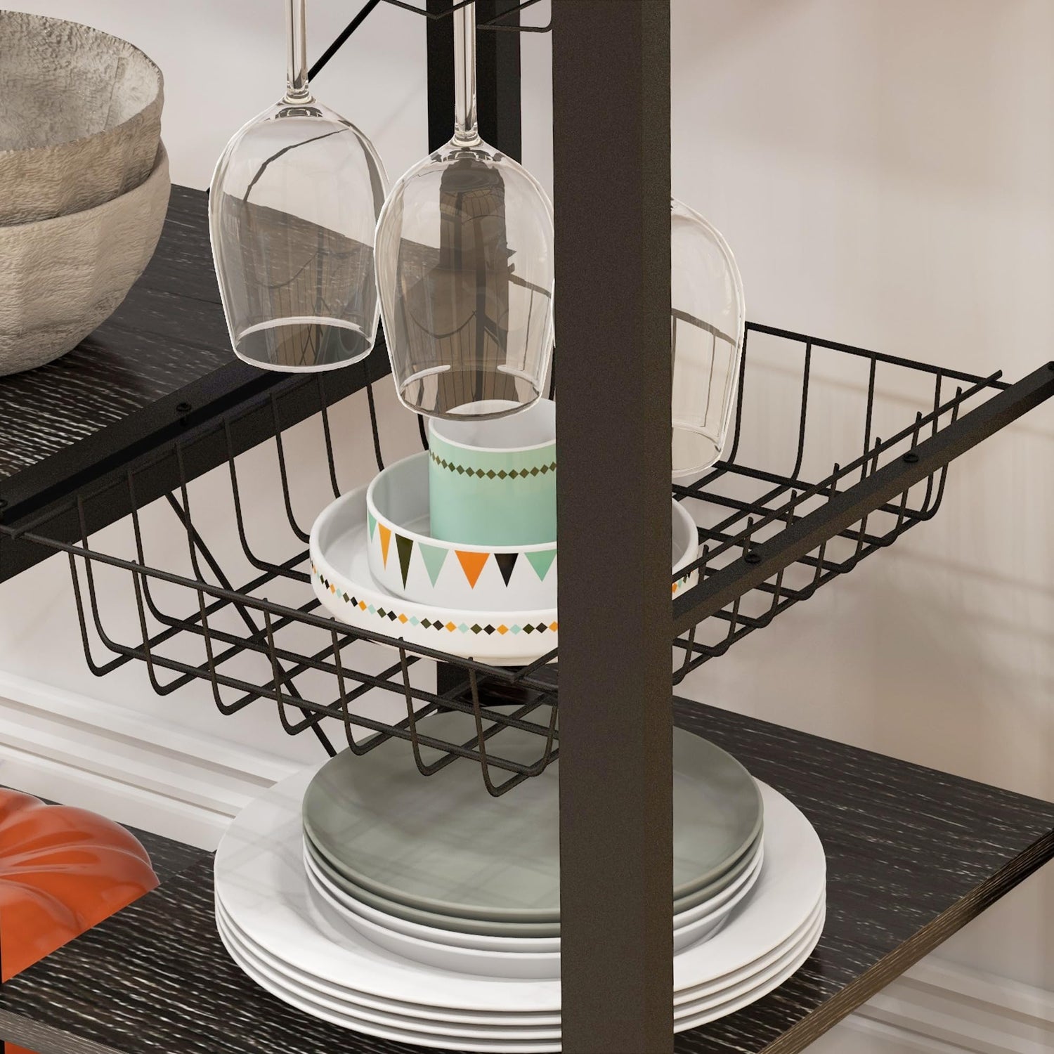 • Space Superhero: Say goodbye to clutter. Our kitchen storage rack features a wide countertop for the microwave oven, multiple shelves (including a 2-level adjustable shelf), 3-row glass holders for up to 9 wine glasses, and a metal basket for your cookware and spice bottles.