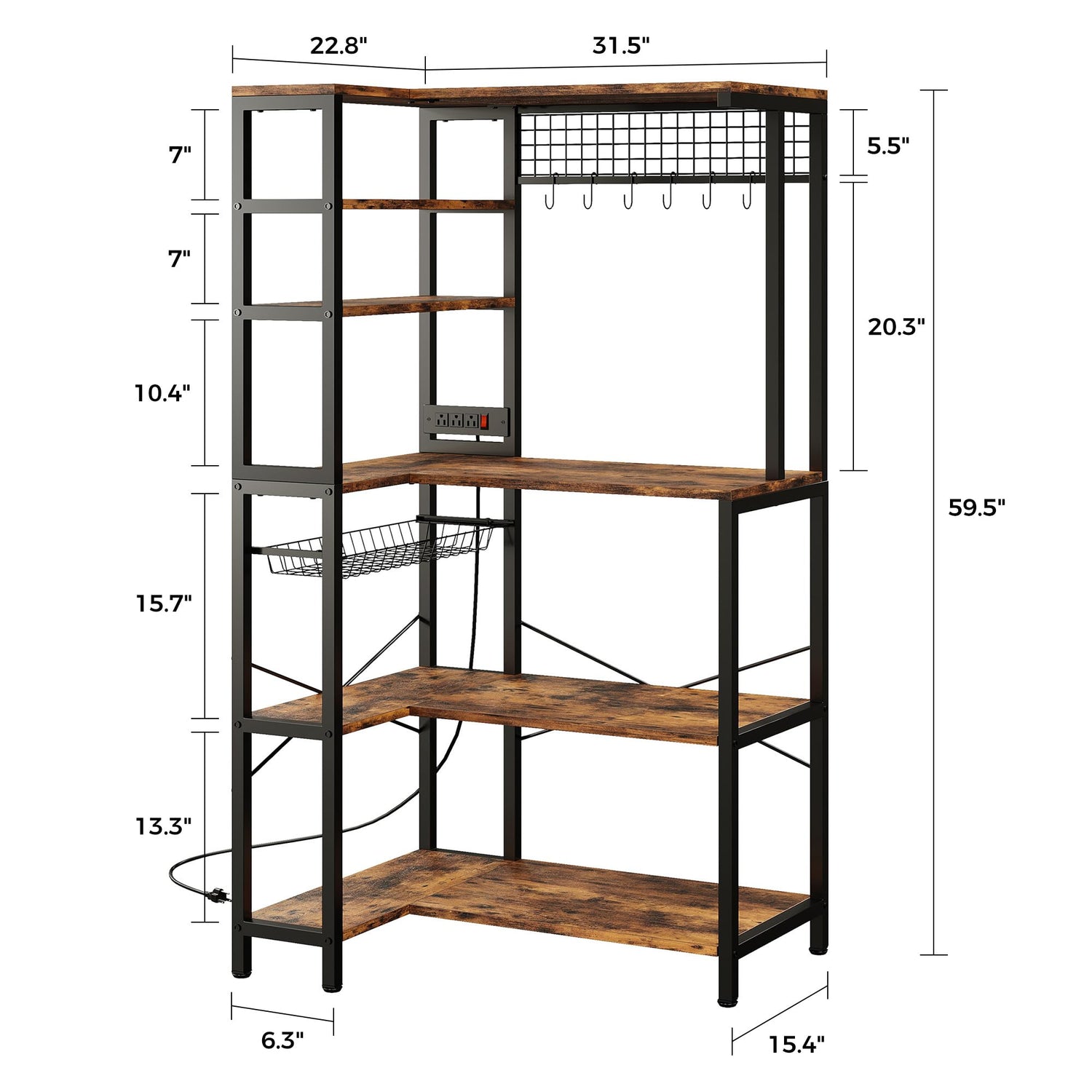 IRONCK Bakers Rack with Power Outlet, 5-Tier Corner Microwave Stand with Storage, Coffee Bar with 6 S-Shaped Hooks, Kitchen Shelves with Wire Basket