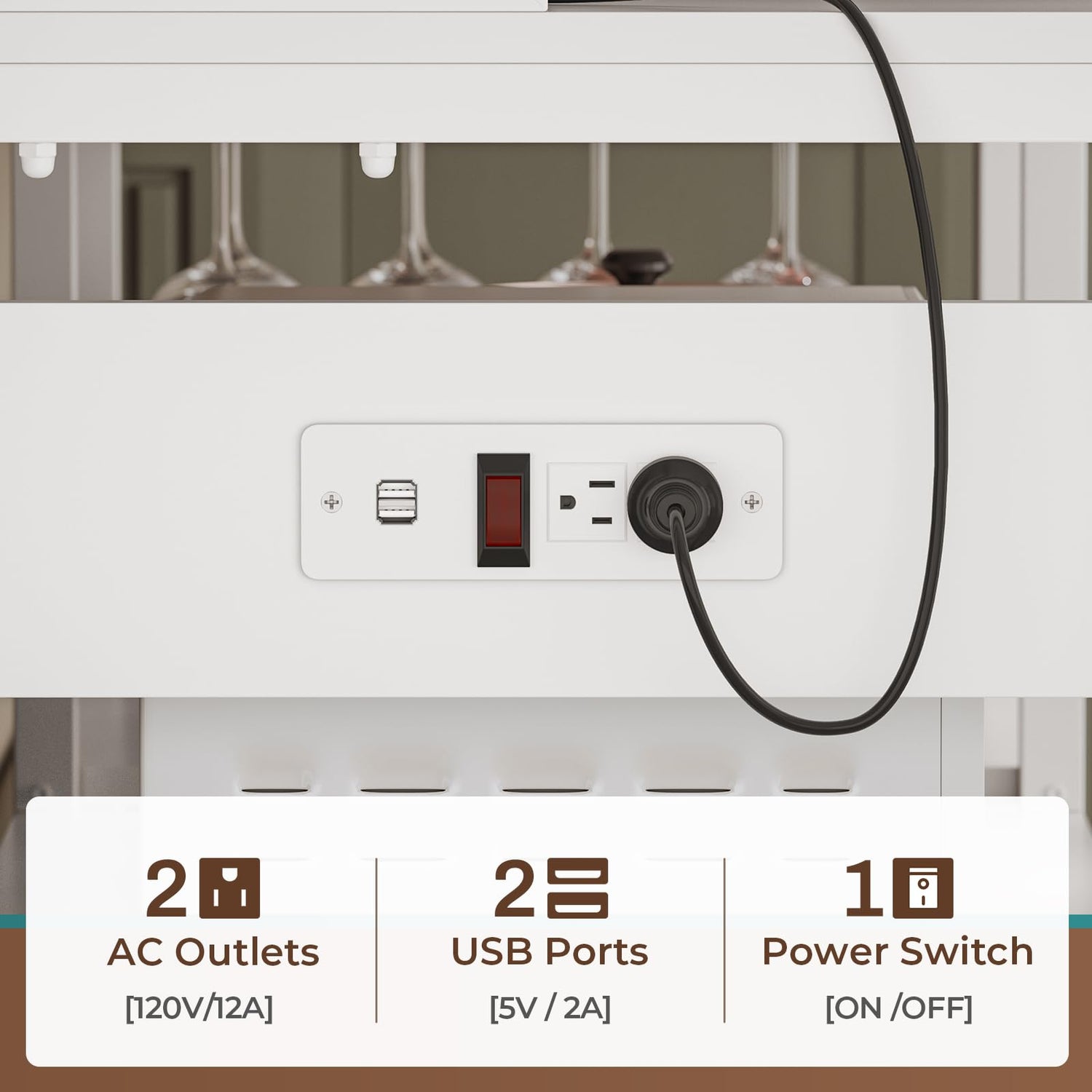 - 【Bakers Rack with Power Outlets】 The table on the frame is made from FSC-Certified wood. This coffee bar is equipped with 2 AC outlets, 2 USB charging ports to provide power for up to 4 devices simultaneously. The switch is convenient and safe to turn off power, no need to unplug appliances at all times. Of course our baker rack comes with RGB LED light strip which can not only increase the atmosphere of the kitchen but also brighten the work area so that you can operate at night.