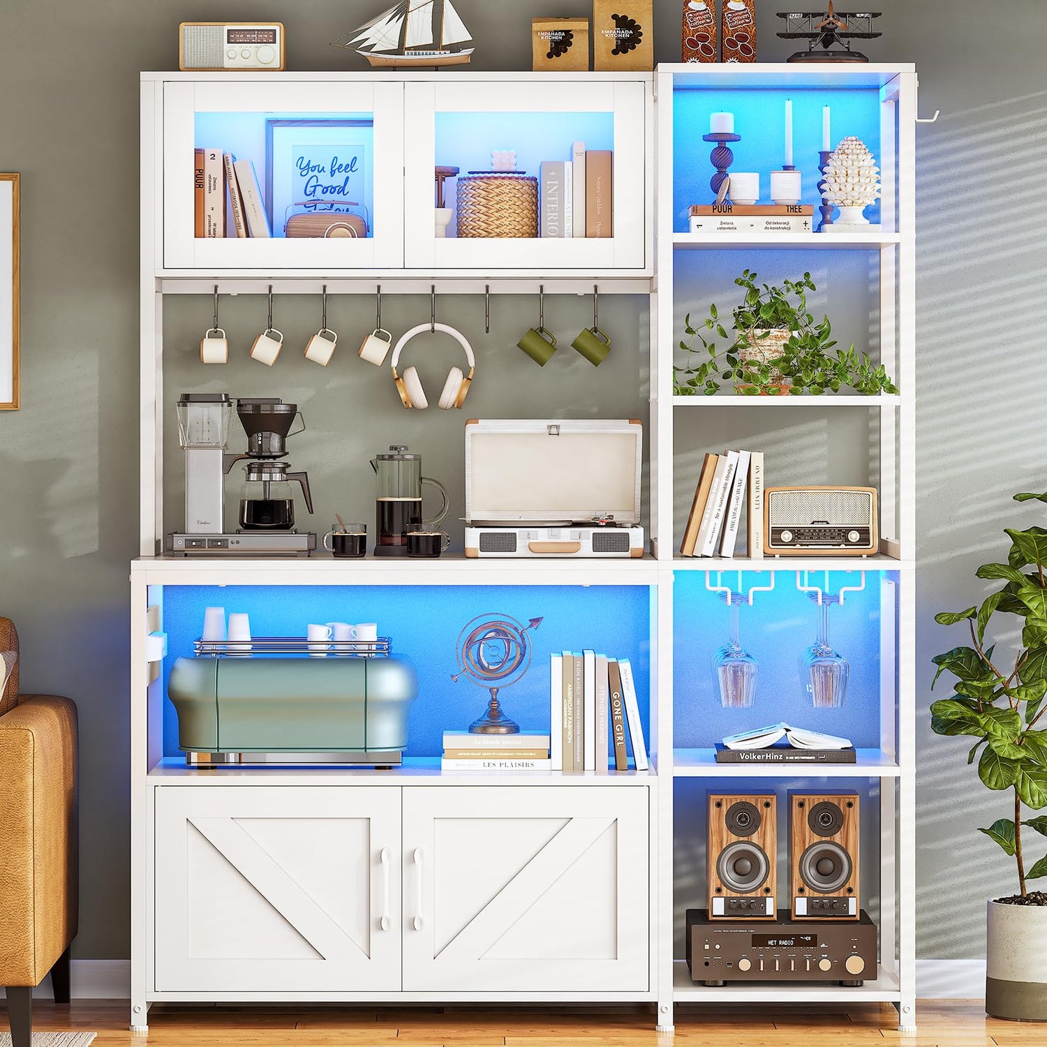 Itaar Bakers Rack with Power Outlet and LED Light, 45.3 Inch Farmhouse Coffee Bar Cabinet, Kitchen Microwave Stand with Storage, Glass Cabinet, Goblet Holder and 8 Hooks (White)