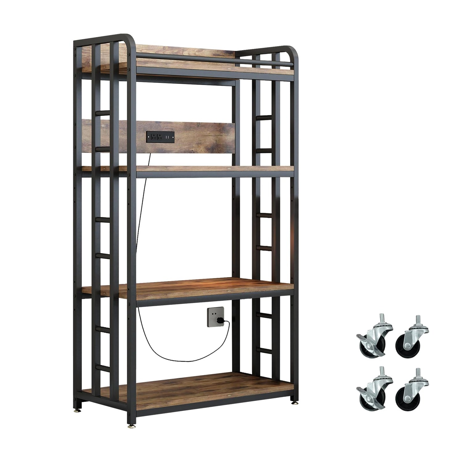 METYERRY Adjustable 4-Tier Heavy Duty Kitchen Baker's Rack with Power Outlet, with Industrial Wheels, Free Standing Microwave Oven Cart Stand for Storage in Living Room, Garage, Rustic Brown