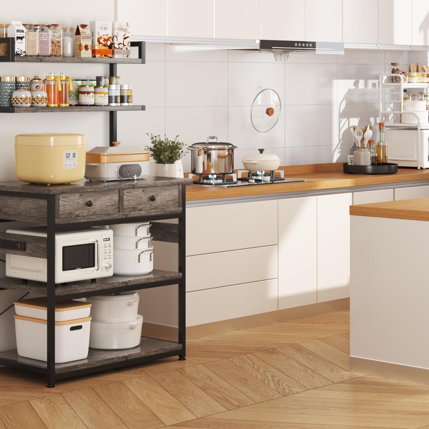 • 【3 AC Outlets & 1 On-off Switch 】 Always need an extra power strip to charge your coffee maker or toaster in the kitchen? A little annoying!The Mexin microwave stand comes with 3 AC outlets for powering multiple devices.The built-in bakers rack power strip is designed with features to manage overloads and avoid leakage.
