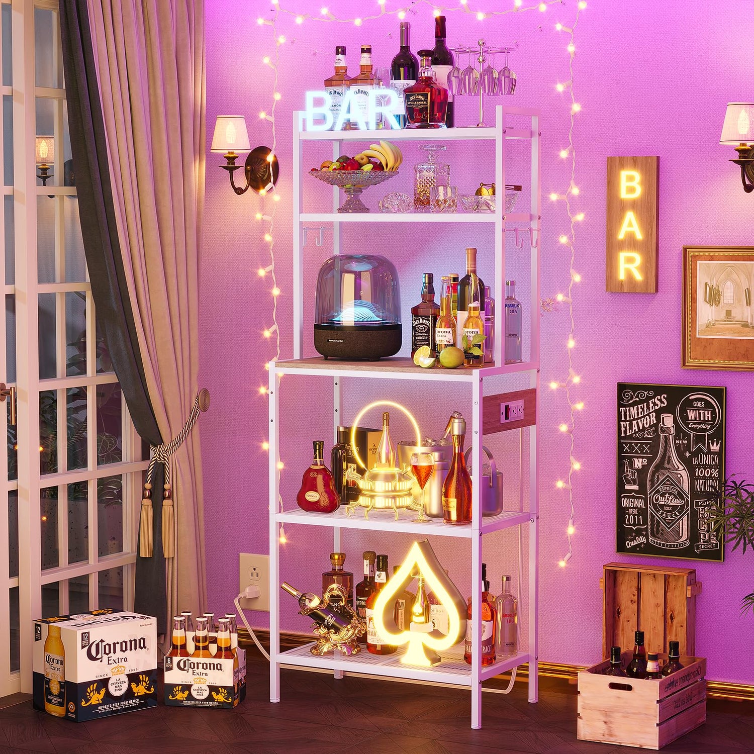 Roxibelt S1 Kitchen Bakers Rack with Power Outlet,Microwave Stand with Storage 5-Tiers,Freestanding Coffee Bar Table with 4 Adjustable Hooks,Kitchen Storage Shelf 13" D x 22.9" W x 58.3" H,Beige White