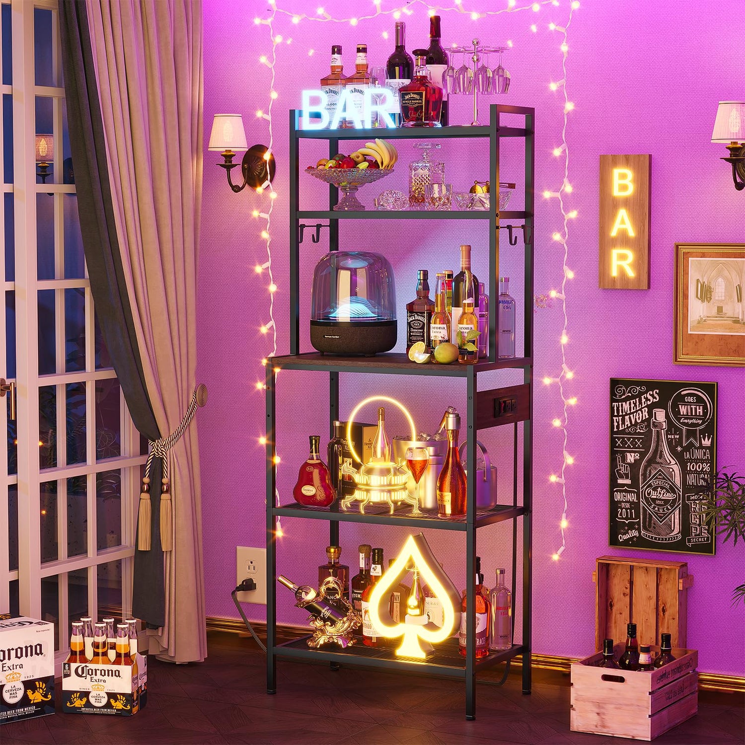 - ▶【Convenient and Safe Power Outlets】Say goodbye to messy extension cords!The coffee bar organizer is equipped with 2 AC power outlets and an air switch button,125V/12A and supporting up to 1500 watts,No need to move your coffee makers, toaster or bread maker, easy to get charging,Depending on your usage habits or need you can swap the sockets left and right!The switch is safe to turn off when not in use,You can now have all your appliances within reach!
