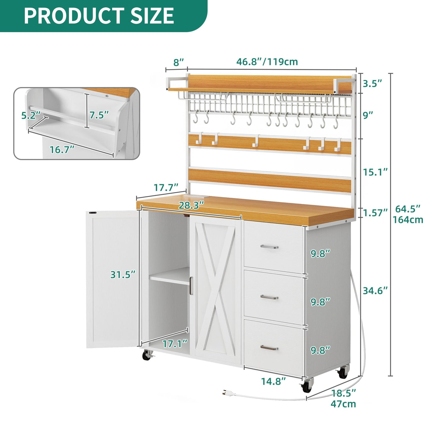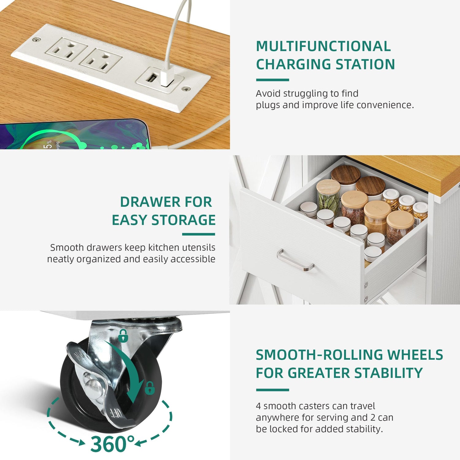 • Large Storage Space: Features a spacious wood tabletop to keep pots and plates within reach, an adjustable shelf in the cabinet for kitchen wares of different heights, and 3 drawers for cutlery. The side rack holds your spice jars or doubles as a towel rack & tissue holder