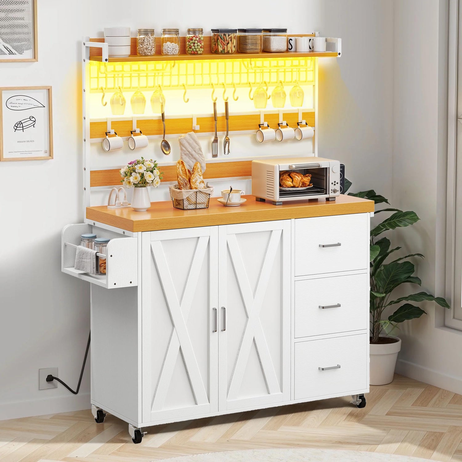 • Bakers Rack with LED Light: Our baker rack comes with LED light strip & power outlet, which can not only increase the atmosphere of the kitchen but also brighten the work area, adding sophistication to your decor