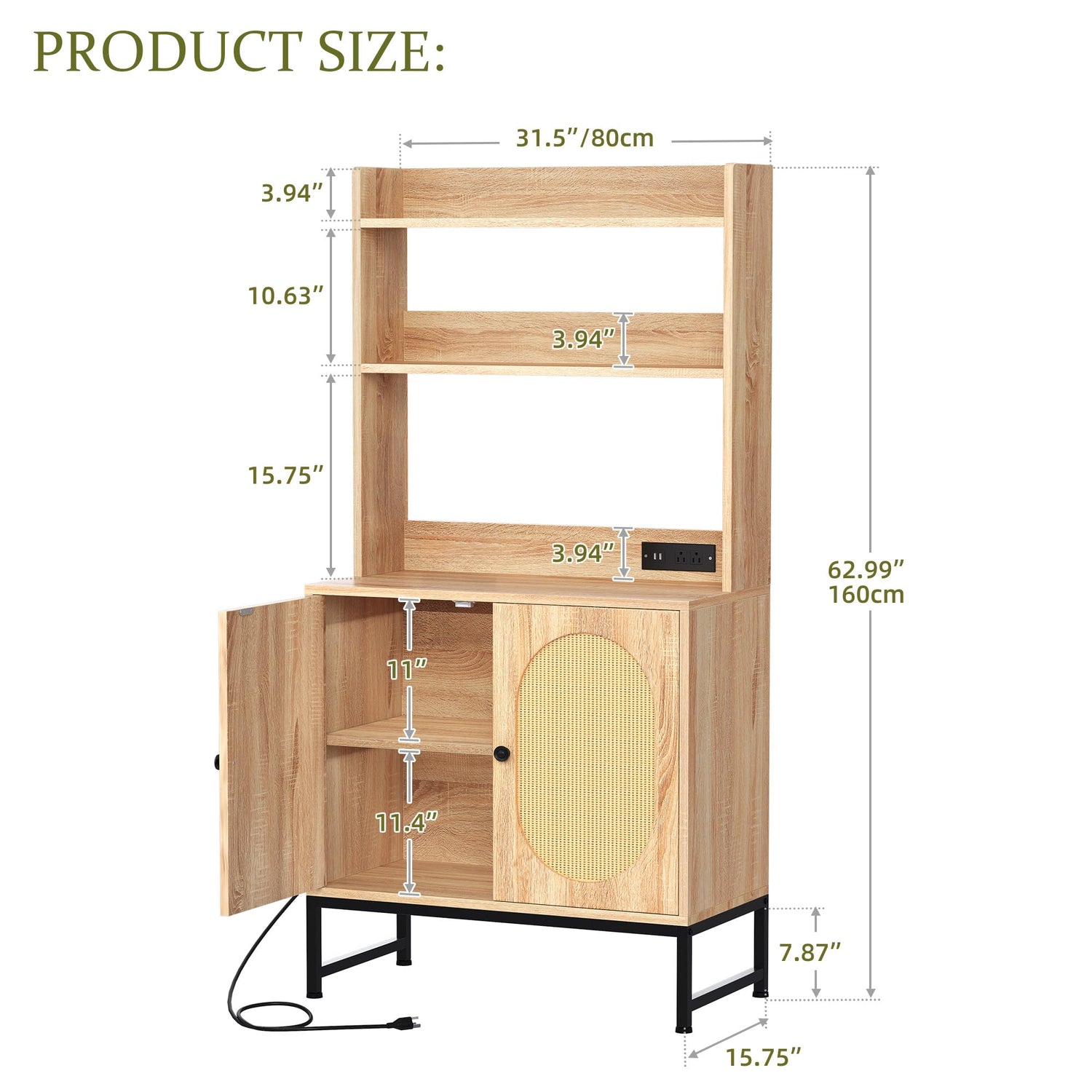 YITAHOME Bakers Rack with Storage and Power Outlet, 5 Tiers Woven Rattan Kitchen Microwave Stand Cabinet, Farmhouse Coffee Bar Station with Hutch Shelves, Oak