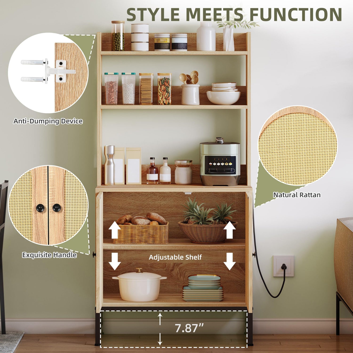 - Generous Storage: Enjoy a tidy kitchen with this baker rack with storage! It includes 3 open shelves for organizing kitchen items and a closed bottom cabinet to protect belongings from dust and moisture
