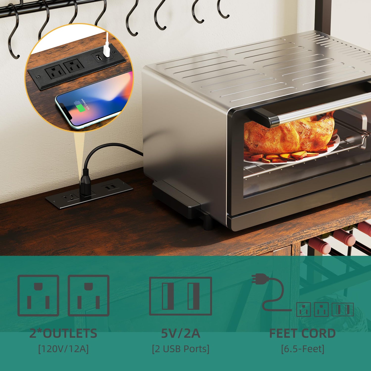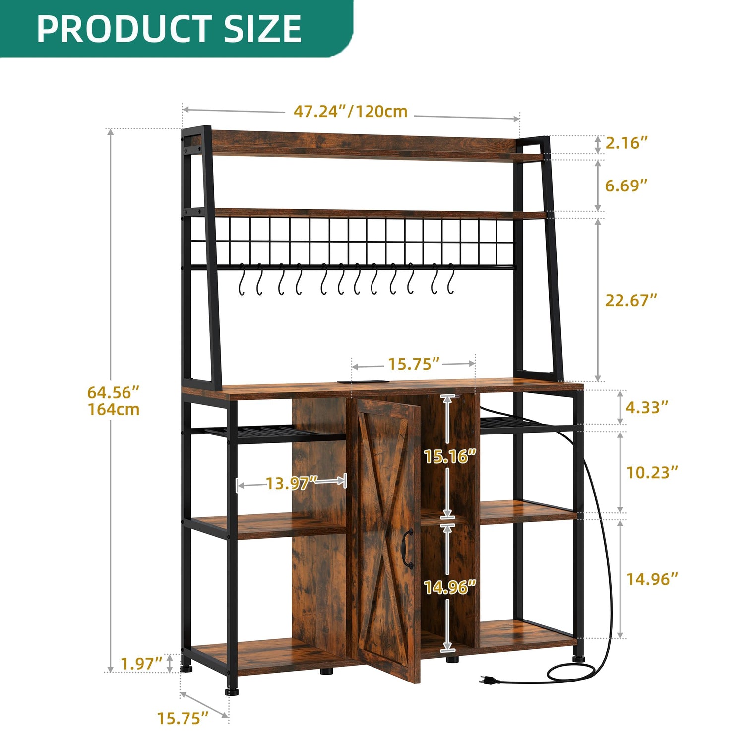 YITAHOME Large Bakers Rack with Power Outlet and Storage Cabinet, 47 Inch Farmhouse Coffee Bar Cabinet, Kitchen Microwave Stand with Wine Shelves and 12 Hooks, Rustic Brown