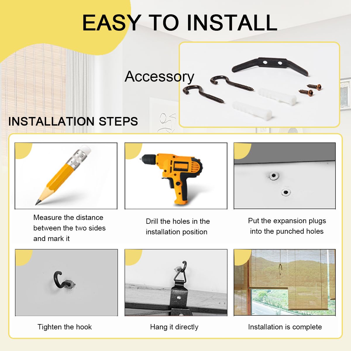 • ▤[EASY TO INSTALL AND CLEAN] Bamboo blinds have hooks and lifters to easily install these bamboo blinds for indoor outdoor windows. And they are very easy to clean, you can easily wipe away the dust with a dry or damp cloth to maintain long lasting beauty and durability.