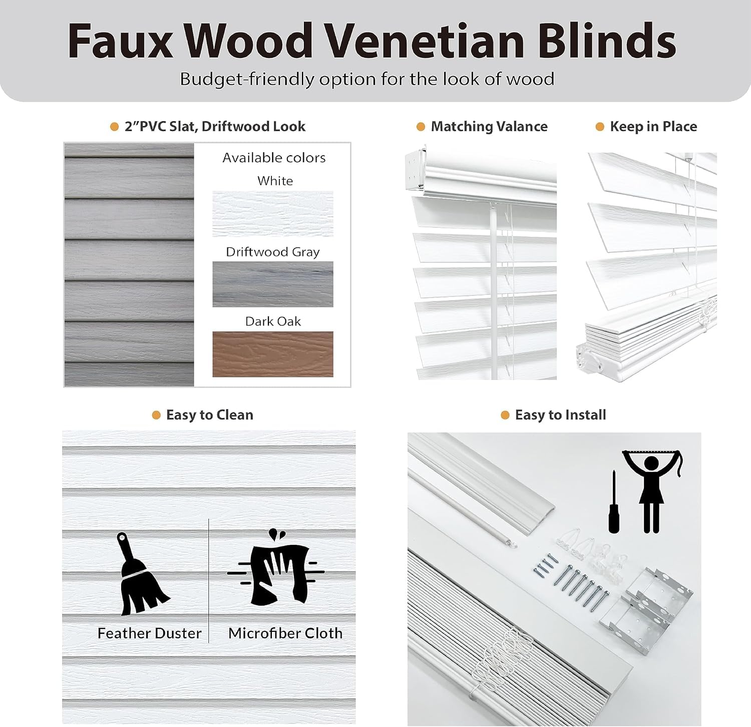 • Elegant Wood Grain Look: These window blinds, with a timeless wood grain appearance, exude premium quality with 2-inch slats and a color-matching valance, perfect for a stylish interior touch.