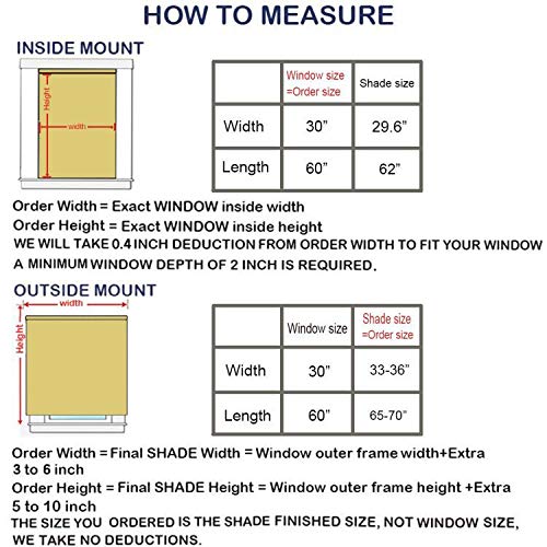 - OUTSIDE MOUNT: Measure the width and height of the area you wish to cover. This is your ordering width and height and we will not make any deductions. Suggest the shade size is 3-10 Inches more than the window size for better coverage