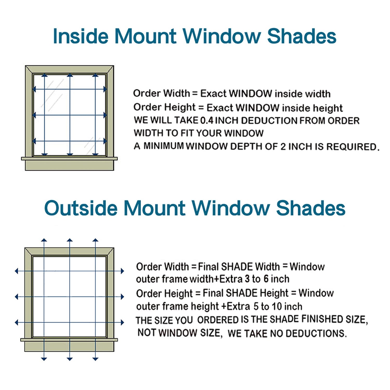 • STEP 4: Select your custom size. For inside mount give us the exact inside opening size(Window and trim) to the 1/8th of an inch and we will take a 3/8 deduction.you need at least 1-3/4"depth for inside mount. 1-1/4"depth may work with solid wood frames using one row of bracket holes. For an outside mount,pls add 3-5inch extra buffer for width and length so it fully cover the window and trim.
