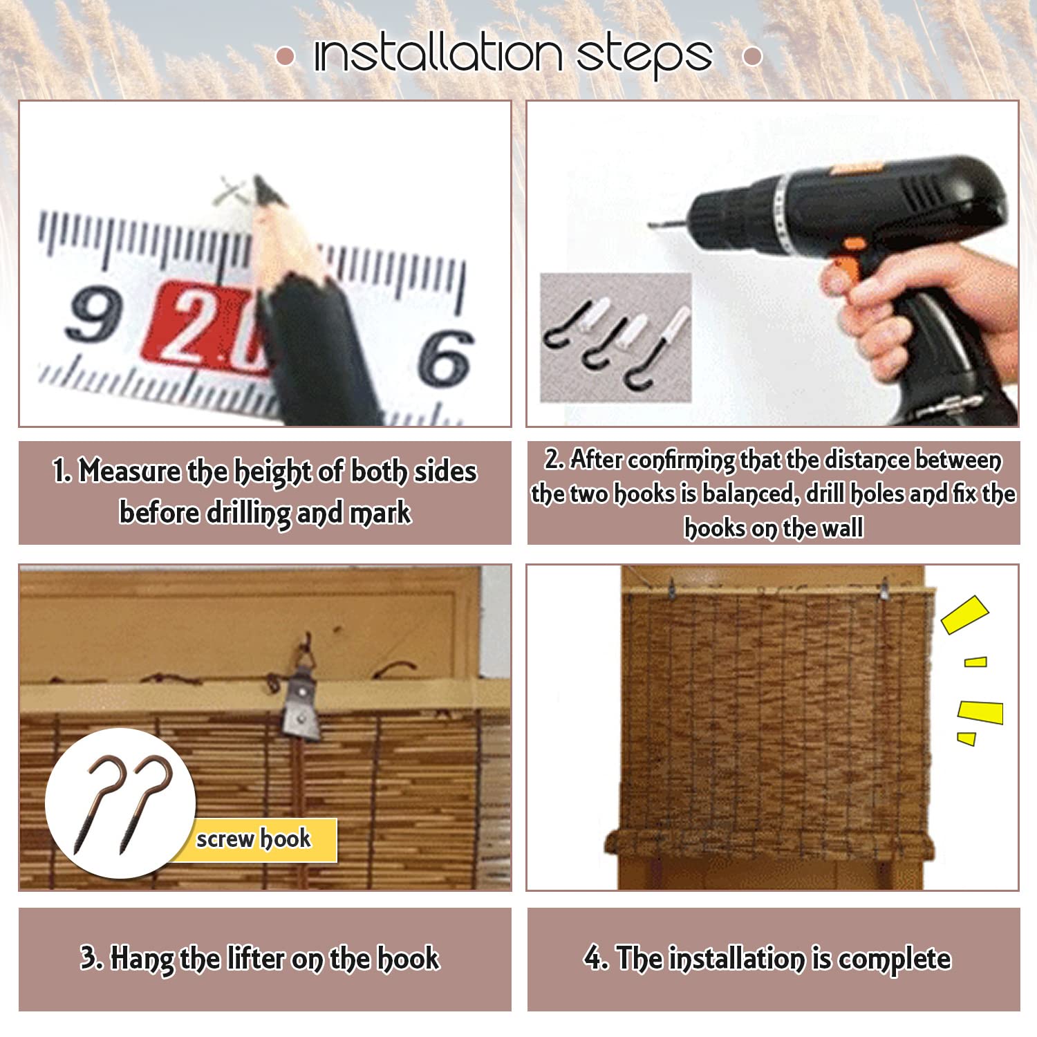 - EASY TO INSTALL: The natural reed curtain is equipped with hooks and screws. How it works: Pull the rope. Installation method: inside, outside, top, side. Our shades that can be easily installed and will remain in pristine condition under any circumstances and weather. Reed curtains can be wiped with wet cloth, and they are still beautiful after long-term use.