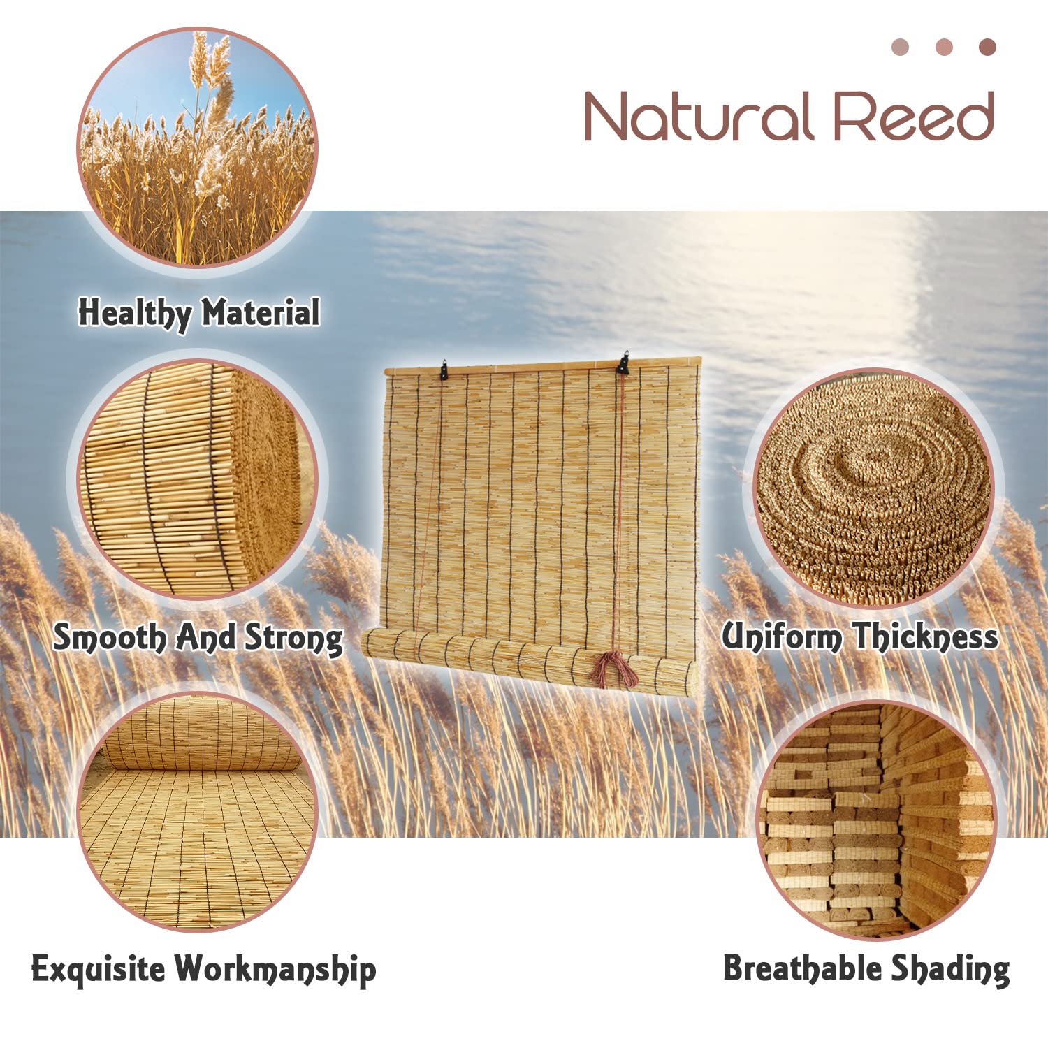 - BLOCK SUN HEAT: Reed Bamboo Blinds Roll Up Shade,100% nature material. The reed roller blinds are made of natural reed rods, with fine workmanship . When the privacy blinds roll up is mounted, are able to block sun heat, protecting you from the sun while bringing down the indoor temperature, keeping your room cooler in scorching summer day. Our blinds and shades will help reduce heat in your home and protect you from harmful sun rays for years to come.