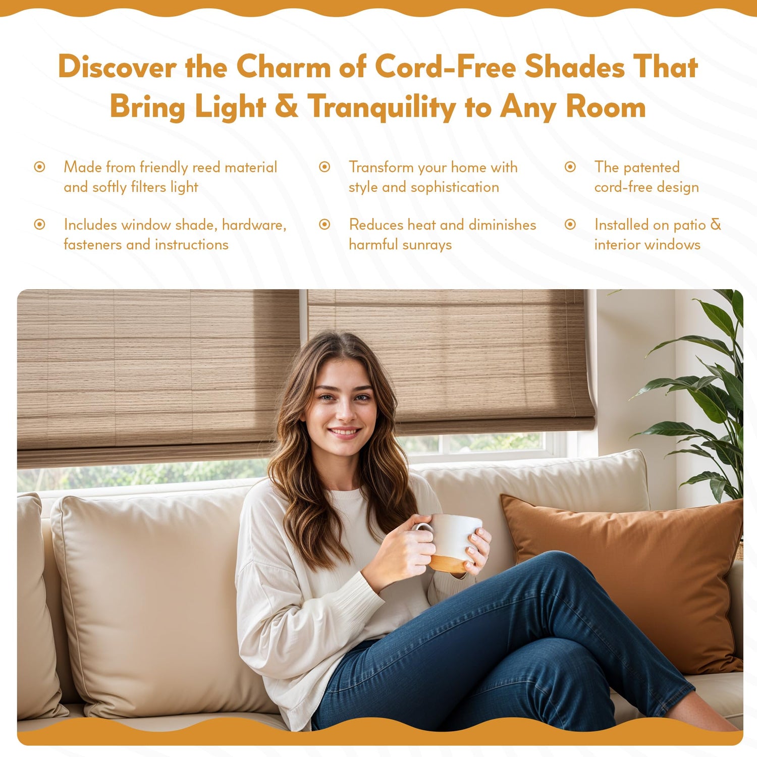 Details: Transform your home with the natural elegance of Radiance Cordless Bamboo Roman Shades. These 34"W x 64"L Driftwood-colored shades offer semi-private light control and a touch of nature to any room. Upgrade your windows with our cordless bamboo roman shades. These semi-sheer, textured shades enhance your decor and filter light beautifully, protecting your furniture from fading. Their rich wood tones and smooth texture add a sophisticated yet relaxed feel to any space. Crafted from 100% bamboo viscose, these blinds are durable and attractive. The robust material ensures your shades will last for years, maintaining their beauty and functionality. Experience ease and safety with our cordless design. These shades glide smoothly up and down without cords, making them perfect for homes with children and pets. They lift and fold up easily, providing effortless control over light and privacy. Our bamboo roman shades reduce glare and protect your furniture from UV damage. The semi-sheer design allows light to filter softly into your room, creating a warm atmosphere while offering privacy. These shades complement jute rugs, hardwood floors, and various furniture finishes, fitting seamlessly into any decor. They're perfect for living rooms, bedrooms, kitchens, or offices. For an inside mount, these shades fit windows 34 inches wide, with an actual blind width of 33.5 inches. This slight difference ensures a perfect fit within your window frame. Designer tip: Add depth and texture by layering these shades under curtain panels or cornice boards. To make a window look larger, consider an outside mount on the window molding or up to the ceiling. What sets our cordless bamboo shades apart is their combination of natural beauty, durability, and ease of use. They offer a perfect blend of style and functionality, enhancing your home with natural charm while providing effective light control. Note: Actual item color may vary slightly from computer monitors due to calibration differences.