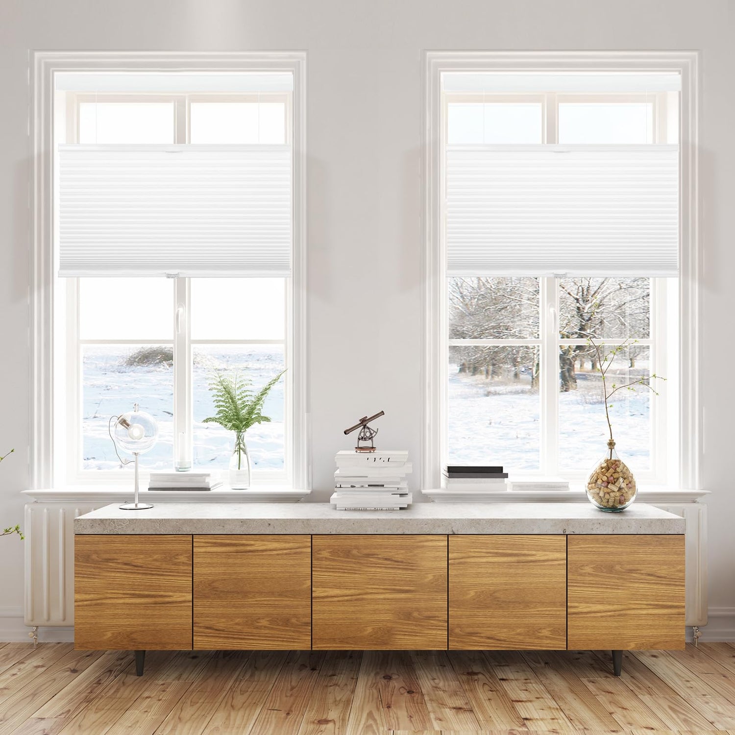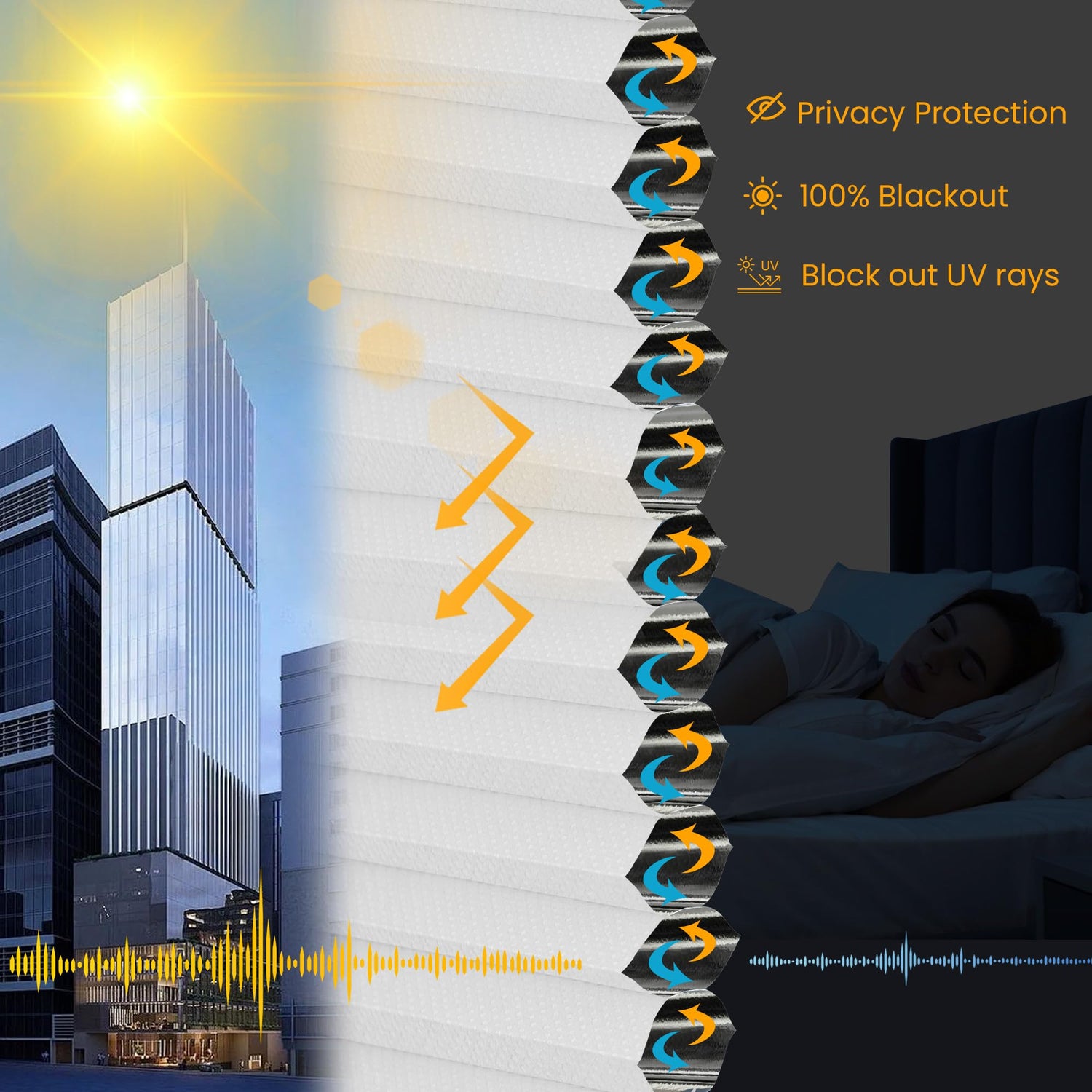 - 【Blackout Cellular Shades & Noise Reduction】the Honeycomb Blinds for Windows adopt a hexagonal honeycomb design, The aluminum foil in Honeycomb shades medical grade fabric can completely blackout light & Noise Reduction. Heat insulation in summer while blocking UV rays from the sun, and helps insulate the room from cold air in winter, creating a comfortable environment inside the house.