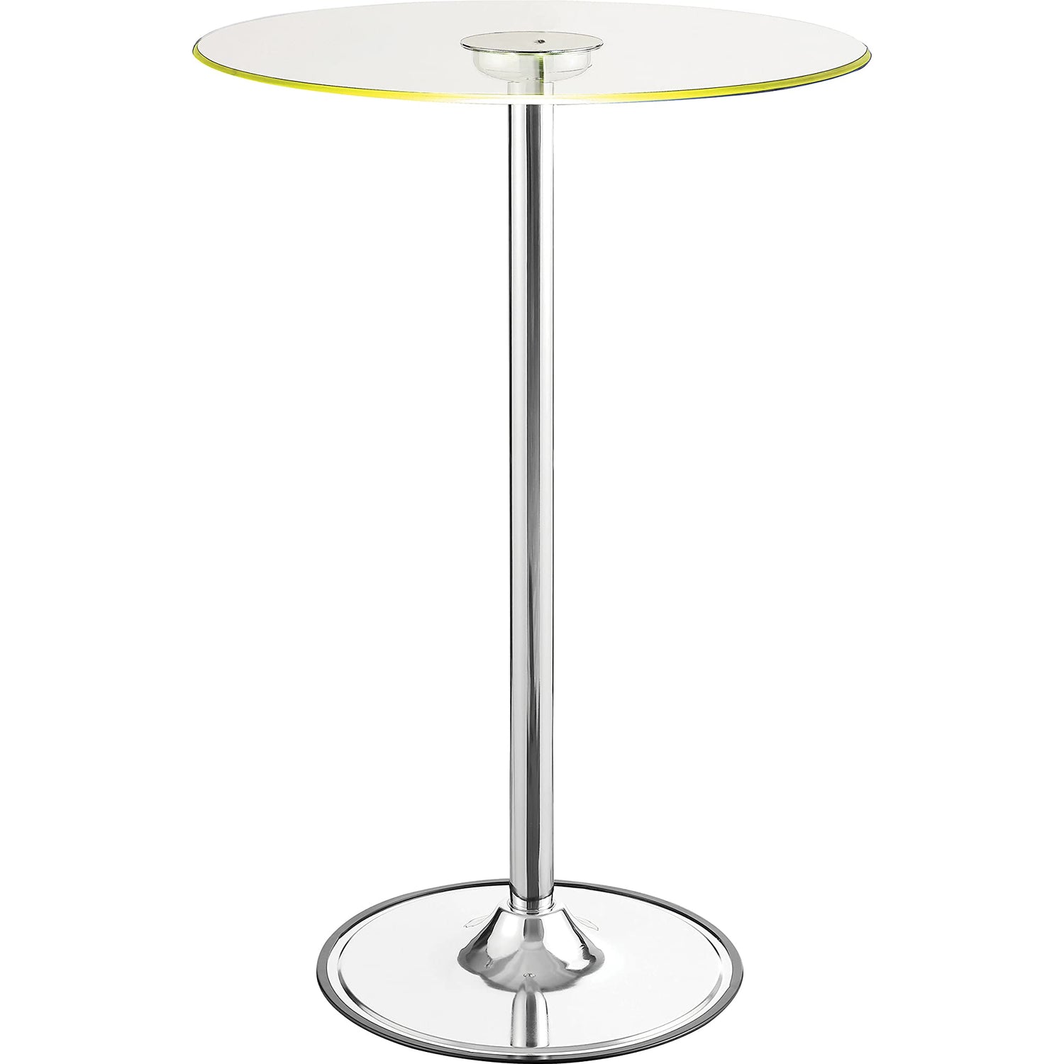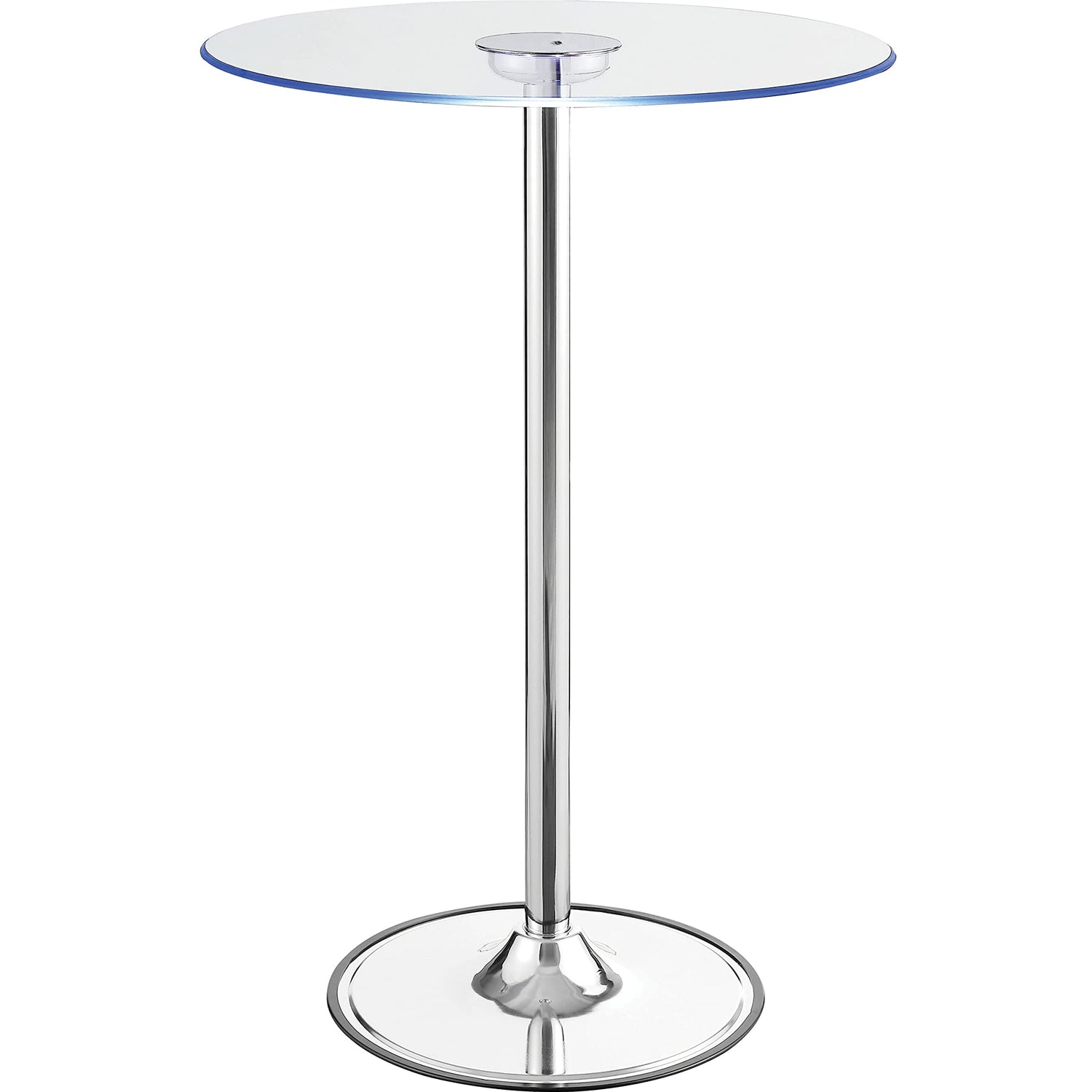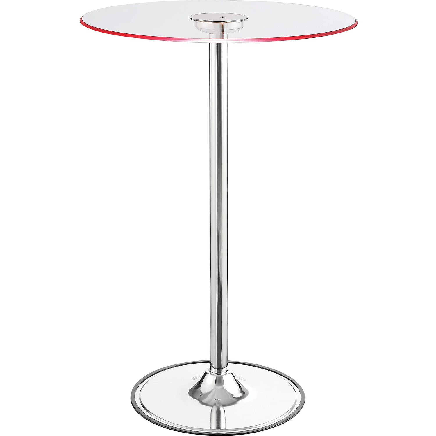 Details: Modern appeal is evident in each and every contour of this contemporary bar table. Its pedestal base boasts a gleaming chrome finish and rounded foot. A petite tempered glass tabletop is clear, adding to a clean, minimalist presentation. The glass tabletop is further adorned with transitioning LED lights. Perfect for a compact breakfast nook or a happening home lounge.