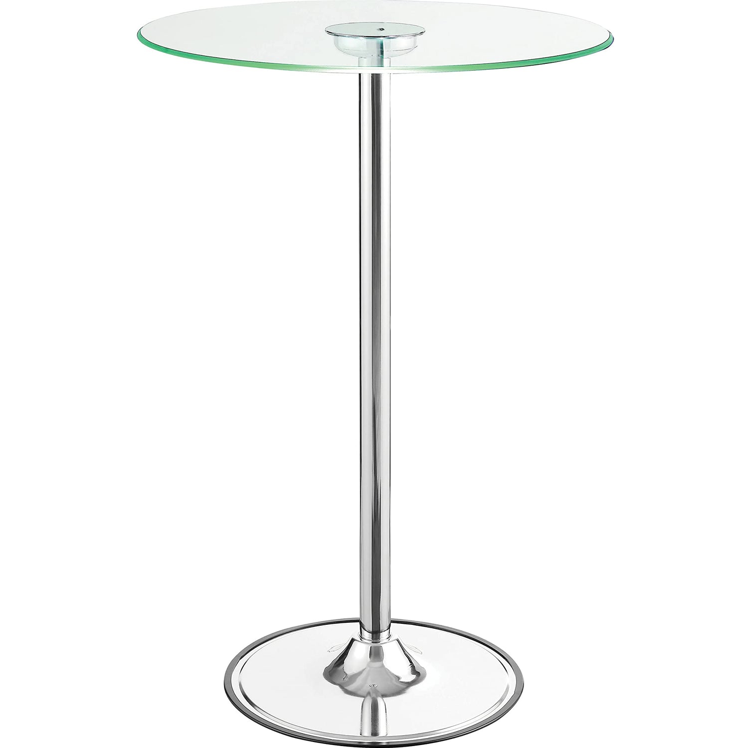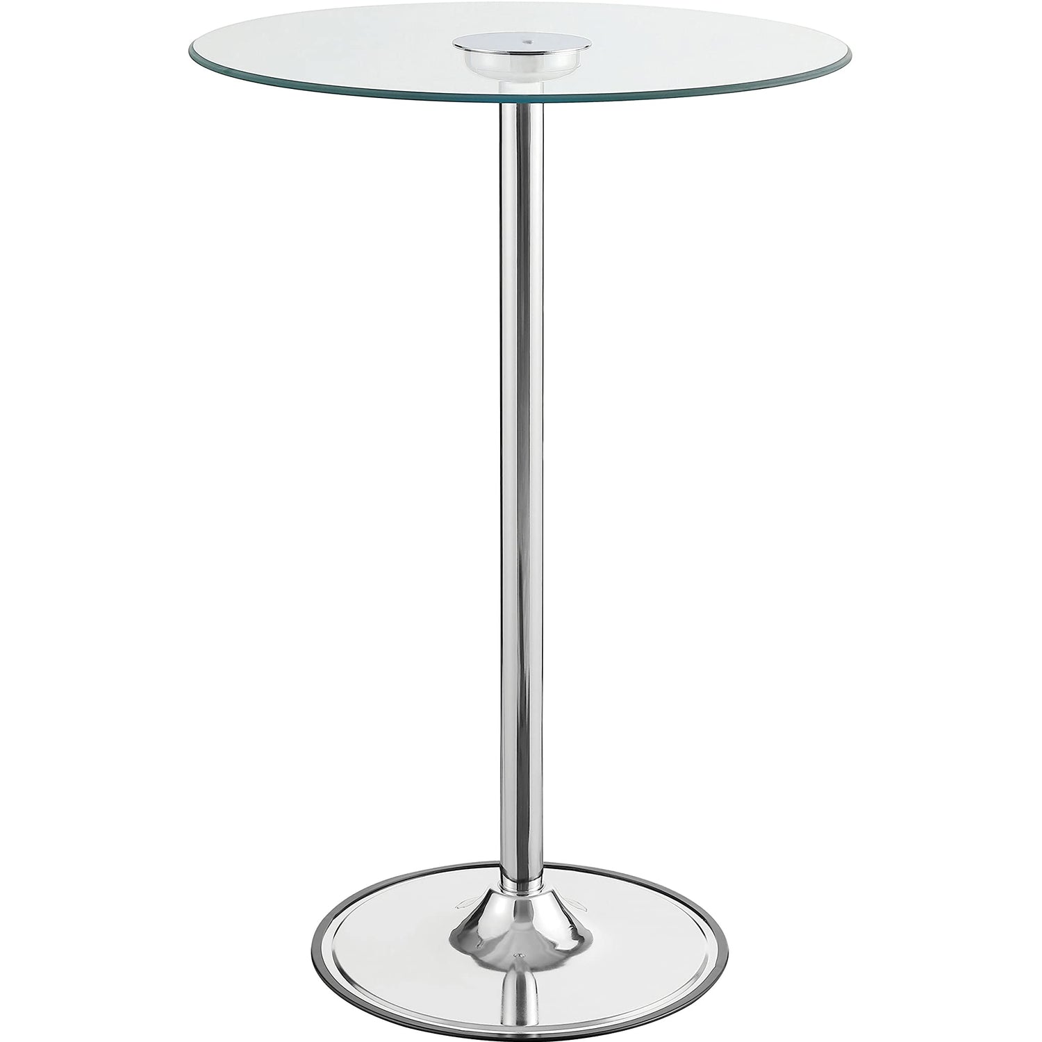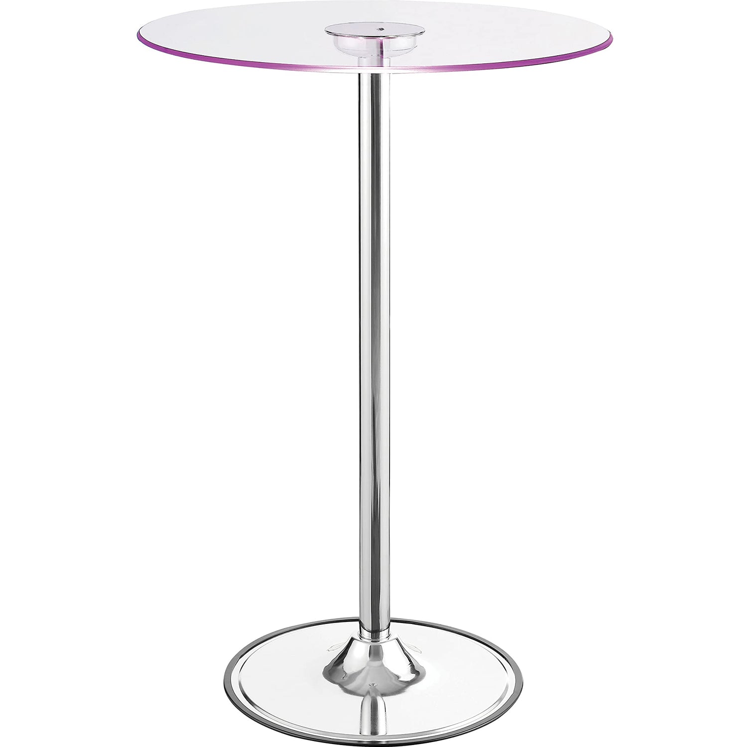 Details: Modern appeal is evident in each and every contour of this contemporary bar table. Its pedestal base boasts a gleaming chrome finish and rounded foot. A petite tempered glass tabletop is clear, adding to a clean, minimalist presentation. The glass tabletop is further adorned with transitioning LED lights. Perfect for a compact breakfast nook or a happening home lounge.