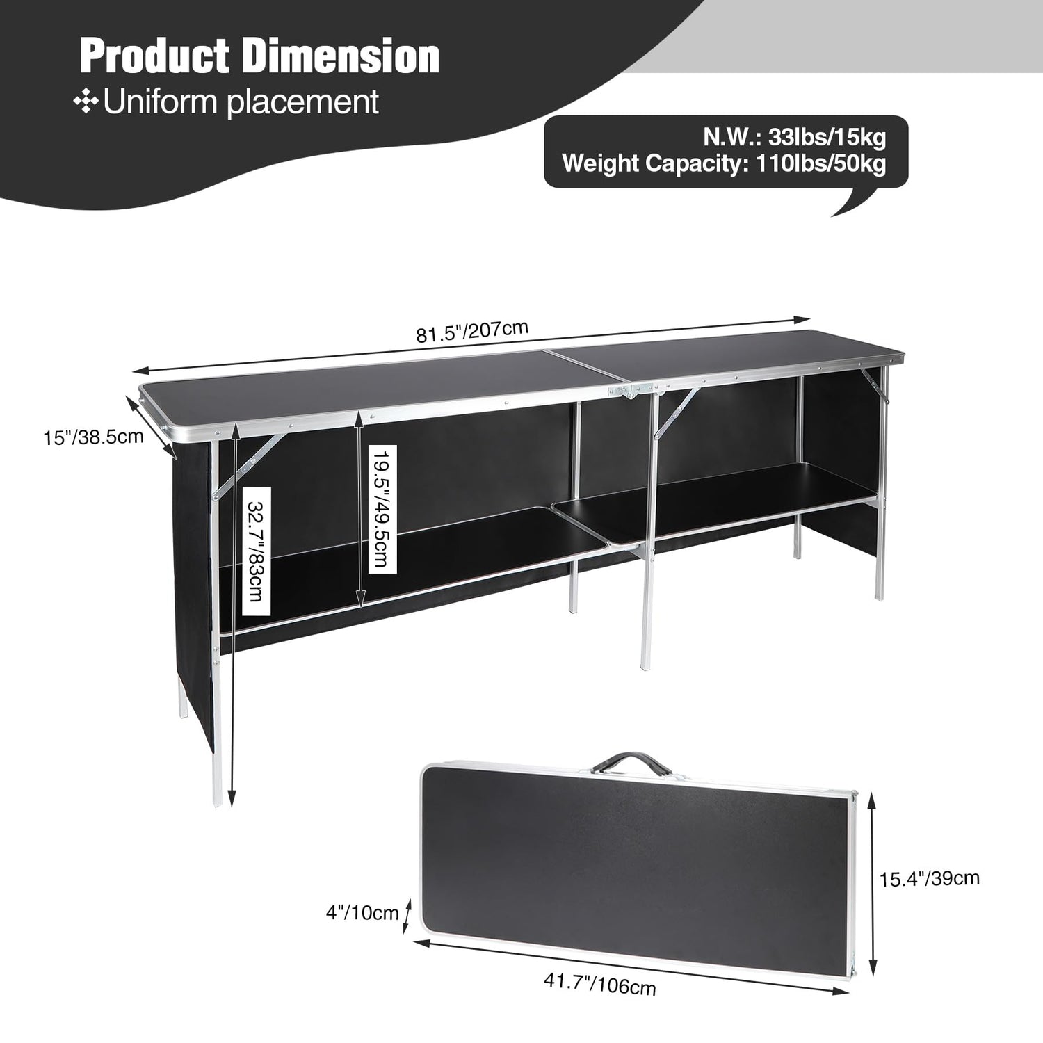 - Spacious Dual-Layer Design: Boasting a generous top surface measuring 82"x15" and 2 lower shelves, this portable bar table offers ample storage space to accommodate drinks, snacks, or display items, making it perfect for parties, exhibitions, and various occasions.