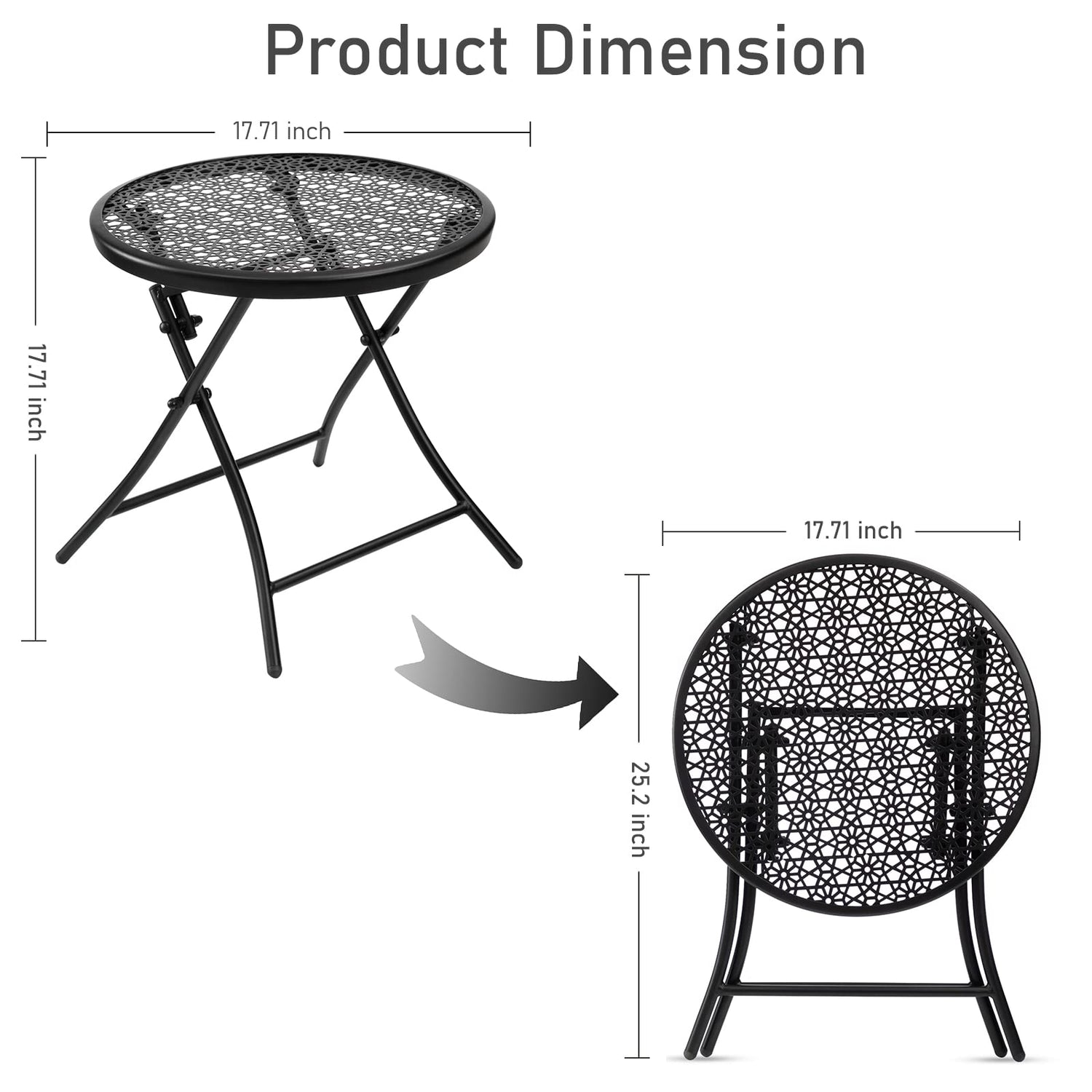 - Saving Space: The table size is 17.71" (D) x 17.71"(H). The folding thickness is 2.36" and folding height is 25.2". It’s super easy to be stored under a bed and sofa, or behind the door and against the wall. This foldable table is easy to move and carry
