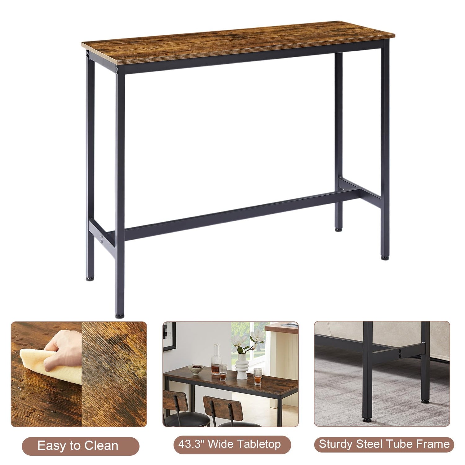 - Space Saving Small Table And Chairs: The bar table and chairs set of 2 has a narrow long table measuring 43.3'' L x 15.8'' W x 35.4'' H and stools measuring 13.4'' L x 13.4'' W x 35.8'' H. Taking up very little space, it can be placed under the table when not in use without obstructing your passage, maximizing the use of space while keeping it clean and aesthetically pleasing