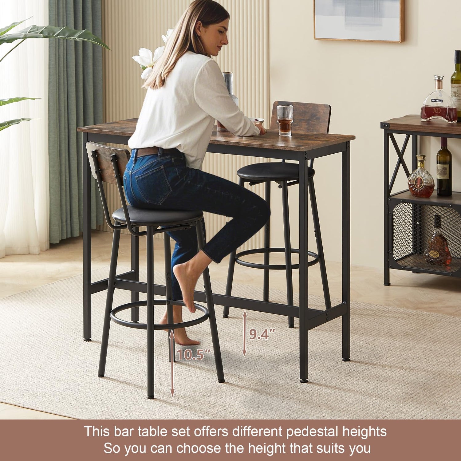 - 3 Piece Small Kitchen Table: This 3-piece bar table and chairs set includes a rectangular high top dining table and 2 counter-height stools with comfortable PU leather upholstery, an ergonomic wooden backrest, and a convenient ring-shaped footrest for a cozy seating experience