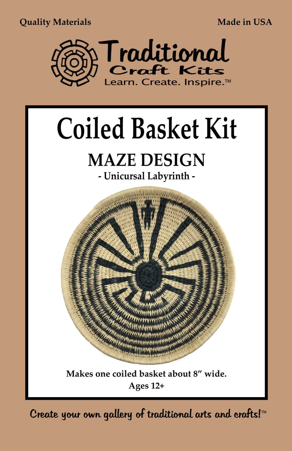 Details: This basket will take approximately 24 hours to complete and it is recommended to stitch in several sessions, taking frequent breaks. Coiling is a basketry method where one material is wrapped around another in a spiral. Generally the materials used for wrapping are soft and flexible while the coil can be a bit more rigid. These instructions will teach you how to coil a shallow tray shaped basket with the design of a maze - Unicursal Labyrinth. The instructions include interesting facts about maze symbolism and importance. Basketry requires patience and perseverance. Keep at it and you will be proud of your improved skills and finished basket. Our kit includes: fiber rush, raffia, tapestry needle, design sheet and color photo instructions This kit also includes a free design sheet should you wish to purchase materials to make a basket of your own design You will need: scissors, ruler, and water Kit makes one coiled basket about 8" wide Ages 12 and up, adult participation necessary for younger ages Made in USA