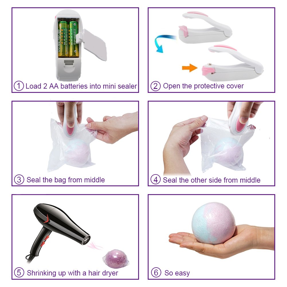 - 228 pieces of bath bomb making set: 200pcs shrink wrap bags,3 size 12pcs DIY metal mould,10 pcs gift bags,5 packs spoons 15g-7.5g-5g-2.5g-1g,1pcs mini heat sealer,1pack instruction