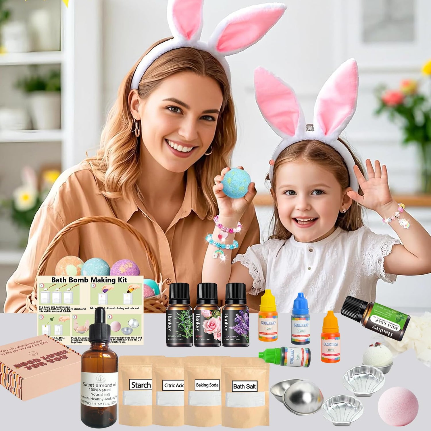 - Package Includes - bath ball set for kids and adults to make your own bath bombs. It includes 1x starch, 1x citric acid for bath bombs, 1x bath ball salt, 1x baking soda, 1x sweet almond oil, 4x metal molds, 4x pigments, 4x essential oils, 1x instruction manual. Create a bath full of bubbles and Enjoy a relaxing bath filled with bubbles and indulge in a self-care moment.