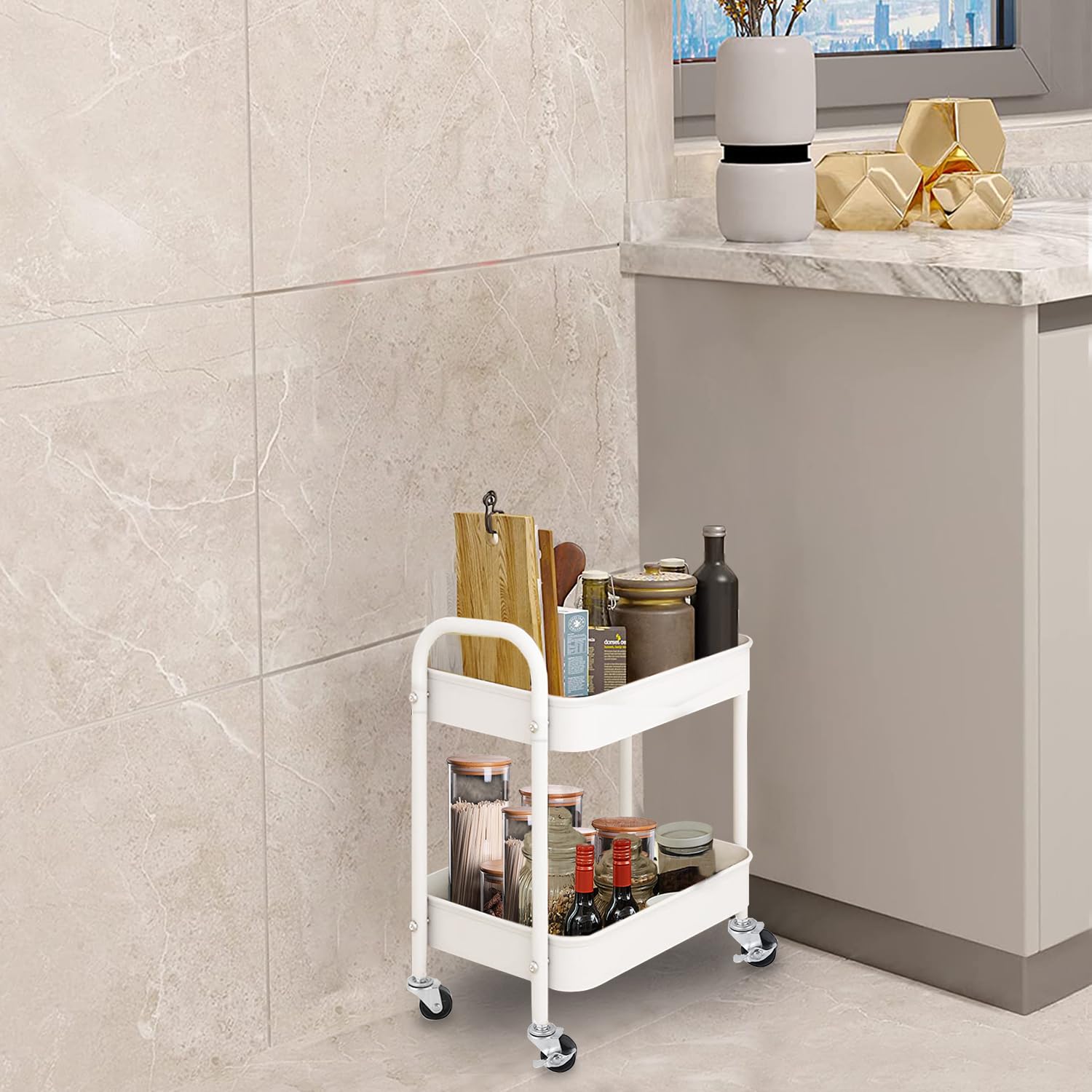 - Decorative and Easy Assembly: Elegant design, fashion color, and textured look are great to be decorative for your room style. Only 10 mins to set up your rolling cart