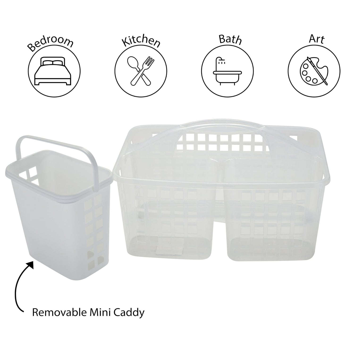 - 2-IN-1: This bathroom caddy comes with one 3 compartment caddy and a removable mini caddy. The removable mini caddy is great if you only have smaller items to transport. It can easily be hung on a hook in the shower.