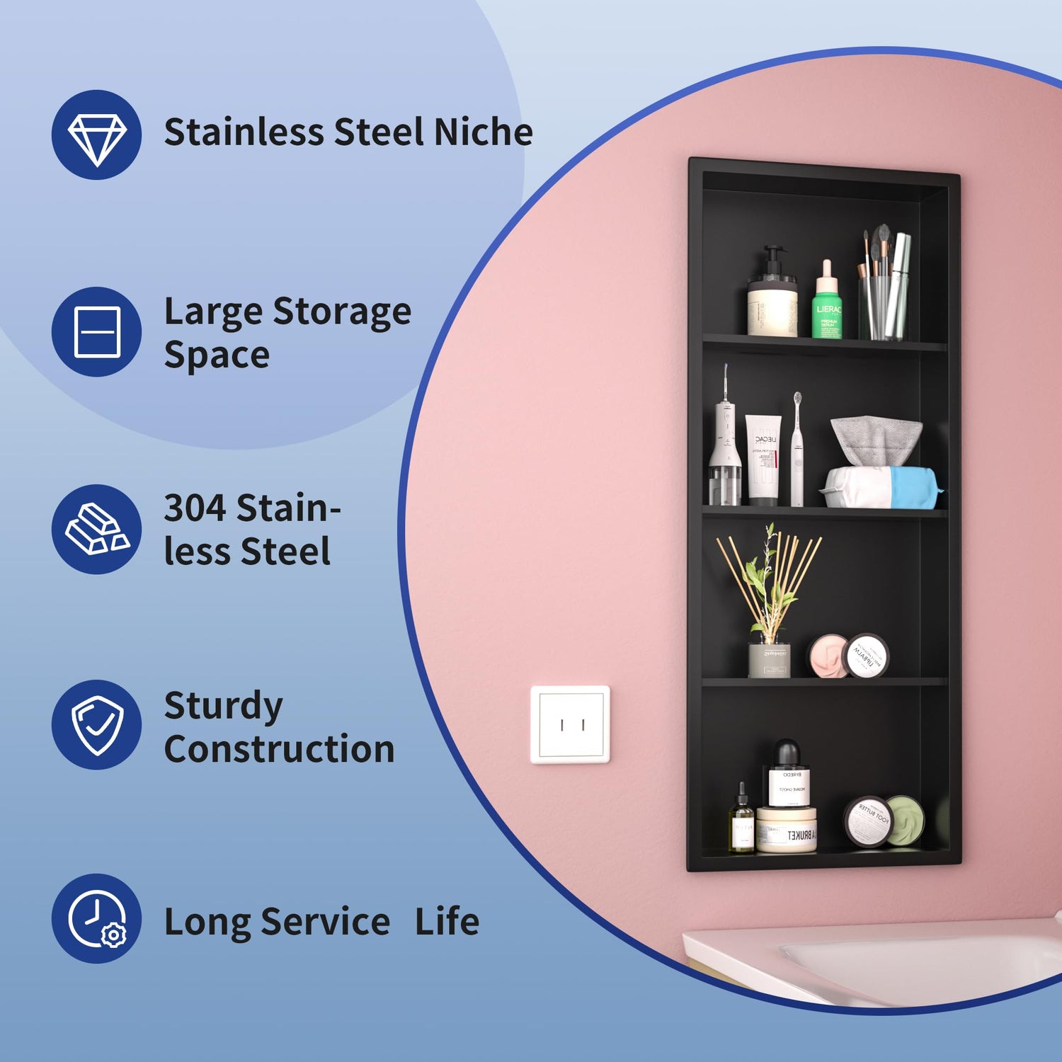 - 【Application and Function】Bernkot black wall niche 36" is a prefabricated stainless shower niche that provides sleek, functional storage solution for showers, bathrooms, and other wet areas. It is not just for wet areas, also can be used for cupboards, medicine cabinet ,bookshelves, etc. It does not take up the building area.