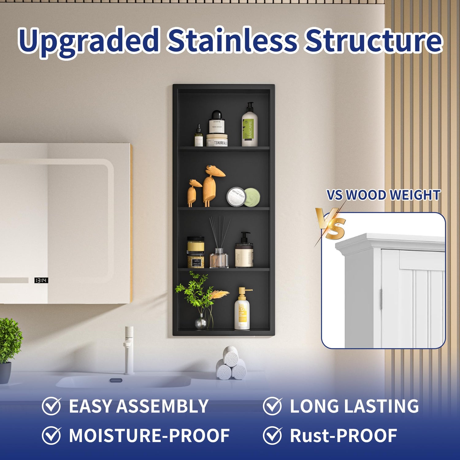 Bernkot Stainless Shower Niche 14"x 36" Matte Black with 4-Tier Shelves No Tile Needed Niche Shower for Bathroom Wall Storage Recessed Medicine Cabinet