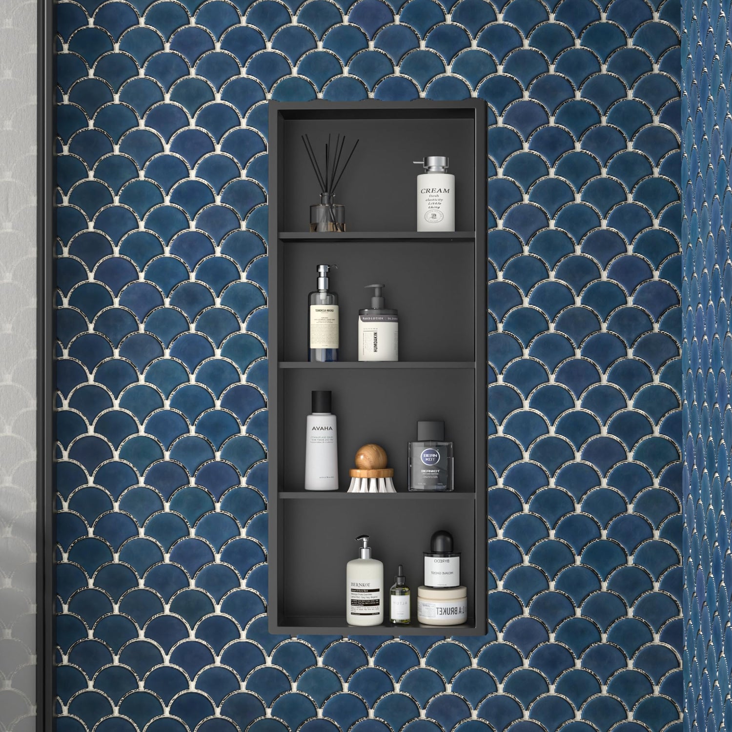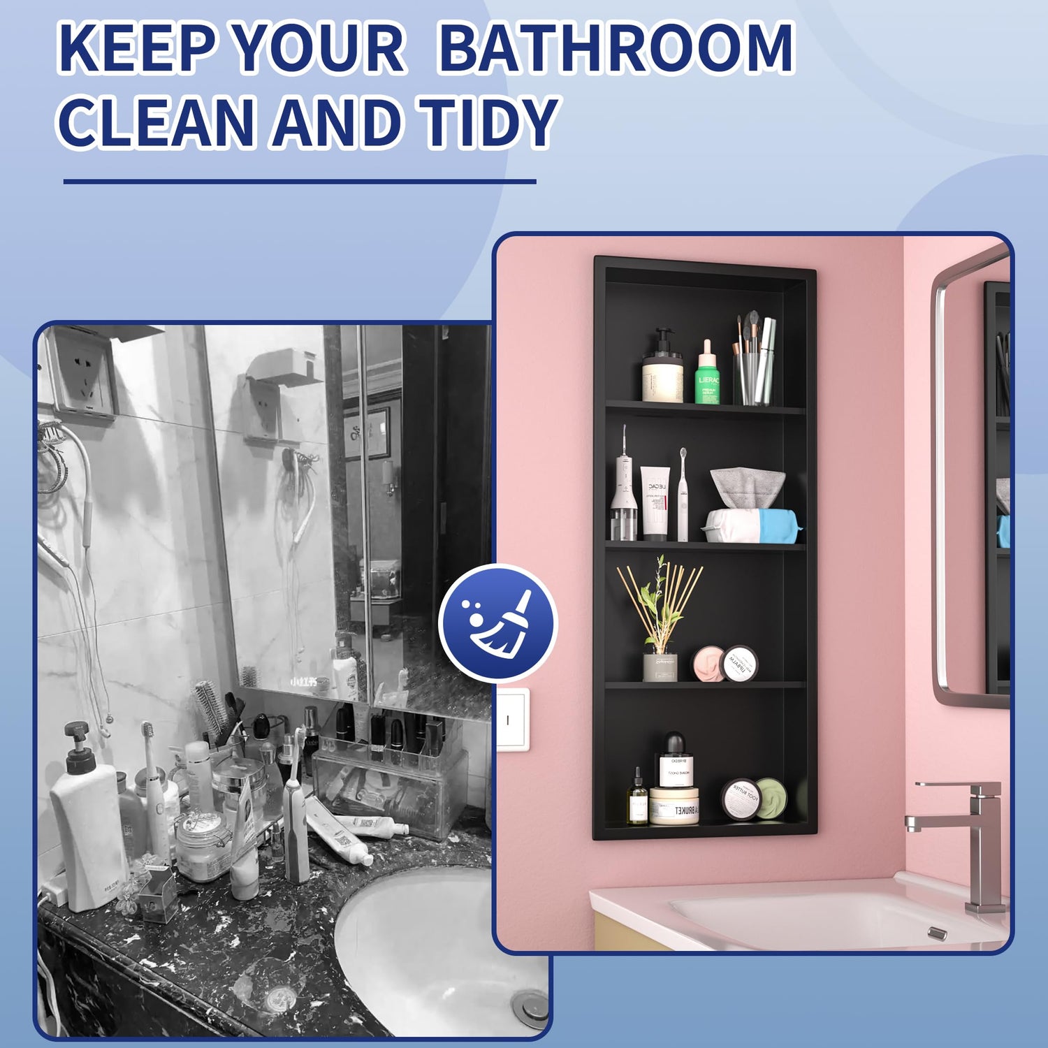 - 【Perfectly Sized 14x36"】Black shower niche 36" with 4-tier shelves. Designed to insert into drywall that won't take up space. Ideal for small areas where you want additional organization.Inner size: 14" Width x 36" Height x 3.94" Depth. Shelf spaces measure 9" tall by 14" wide. Be sure to measure your space for accuracy before ordering.