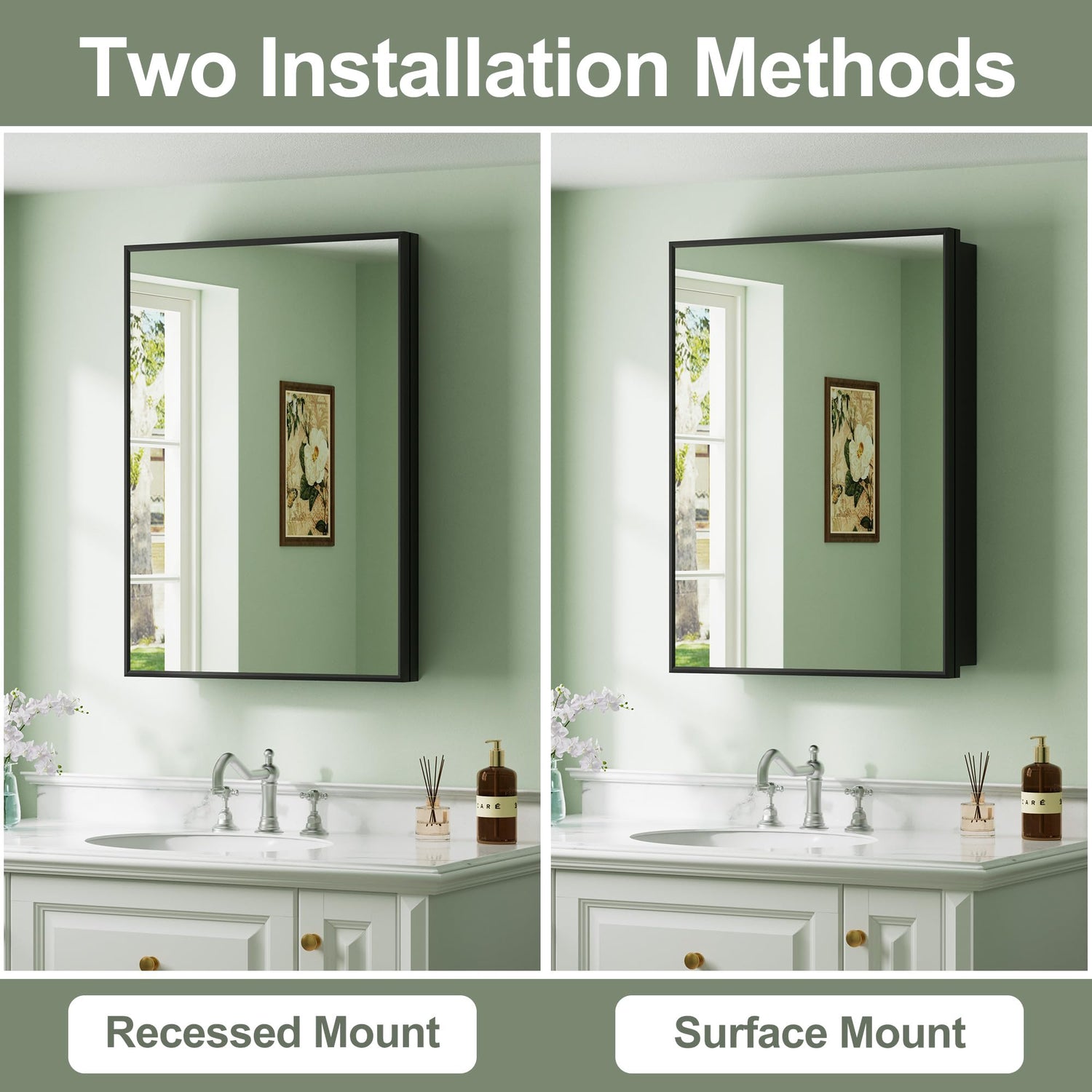 Buruis 14"x 24" Framed Medicine Cabinet with Mirror, Recessed or Wall Mounted Bathroom Cabinet, Adjustable Tempered Glass Shelves, Left/Right Open Reversible, No Assembly Required, Black