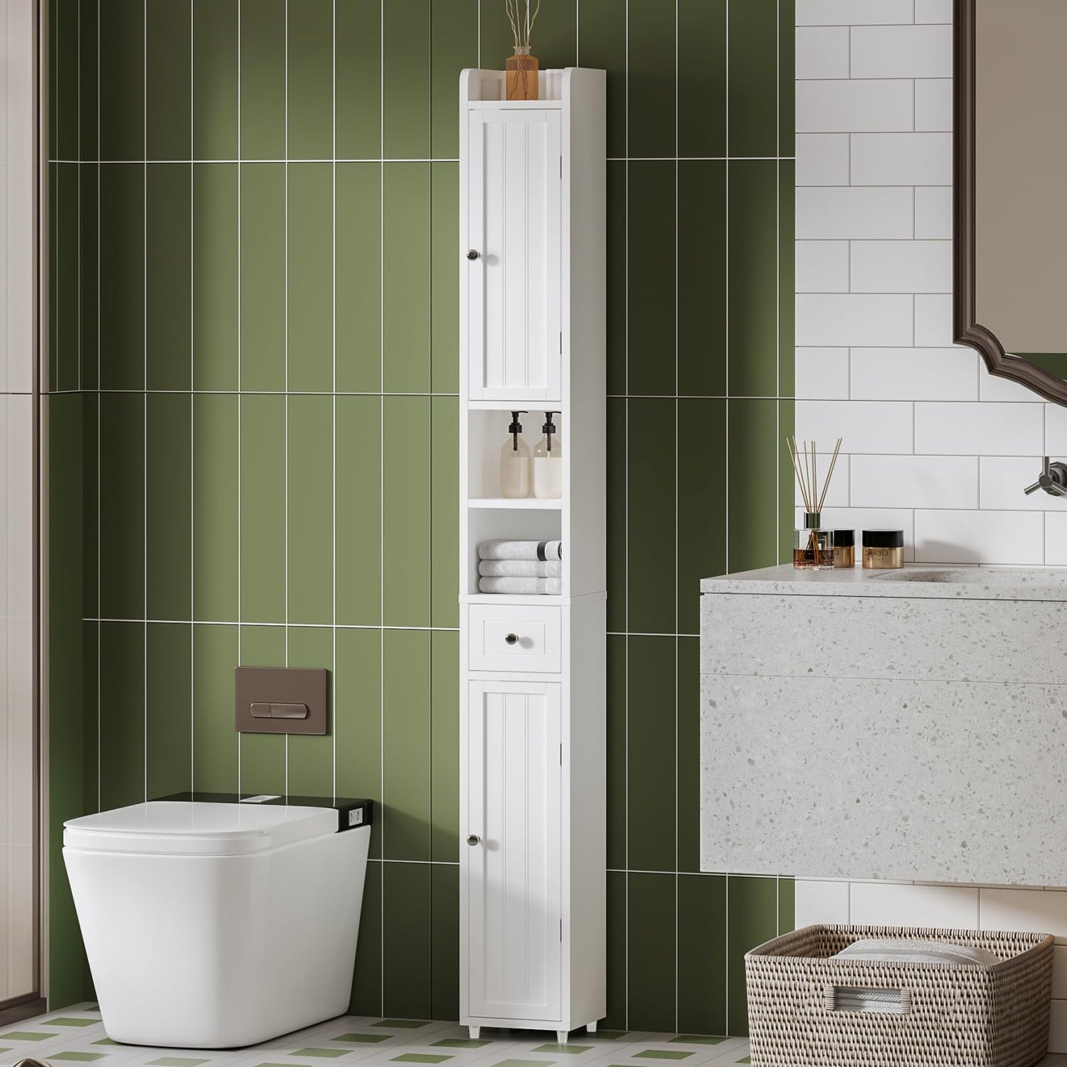 - 【Ample Storage with Adjustable Shelves】This slim bathroom storage cabinet features 2 doors and 1 drawer. The multiple storage compartments are fitted with adjustable shelves that allow you to customize the storage space to accommodate different-sized items, from toiletries to towels, keeping your bathroom neat and organized. Extra cupboard tops for aromatherapy or other small decorative items