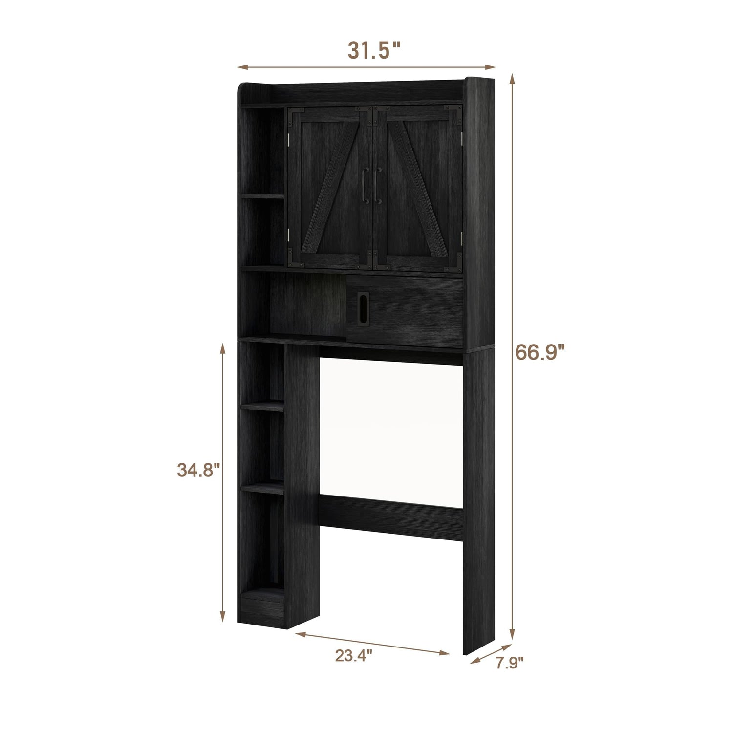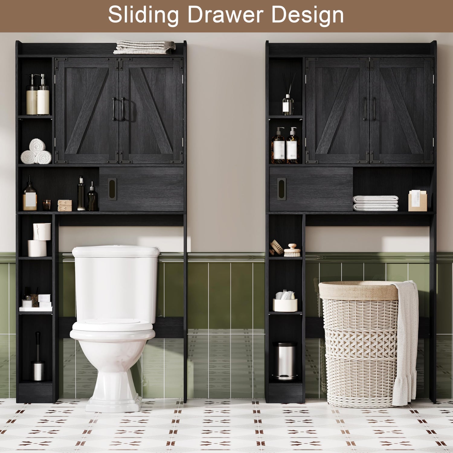 ChooChoo Over The Toilet Storage Cabinet, Farmhouse Bathroom Storage Cabinet with Barn Doors, Sliding Drawer, Adjustable Shelves, Space-Saving, Black