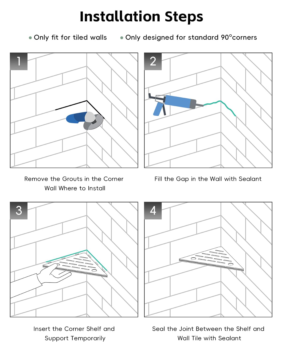 • Effortless Installation: Engineered for straightforward setup, these shelves can be easily installed in any recessed corner of your bathroom. No complex tools or skills required, saving you time and energy