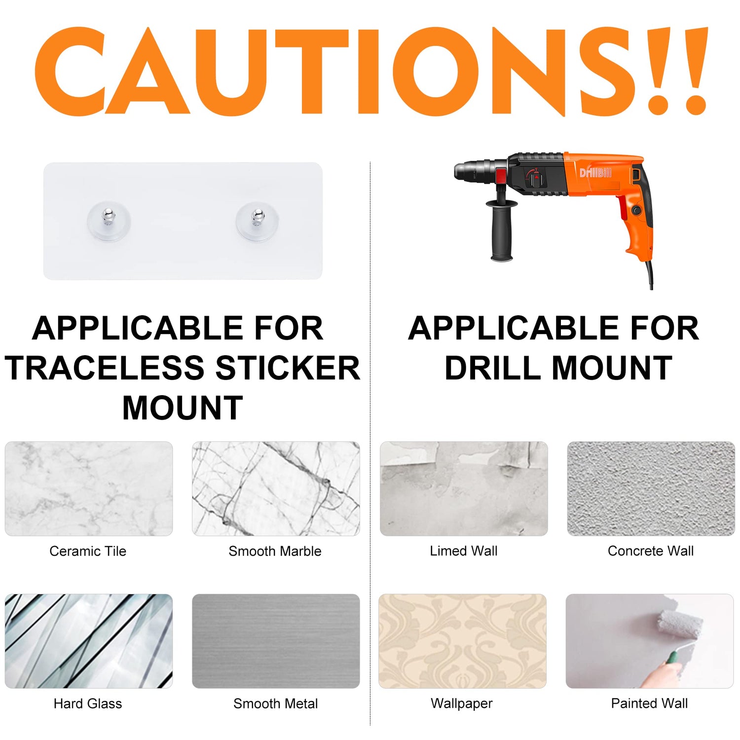 • 【Suitable for a variety of surfaces】The shower racks for inside shower can be stick on various smooth and clean walls, such as smooth ceramic tiles, tempered glass, marble, metal surfaces, etc. You have to use screw installation on rough walls, such as wallpaper walls, cement walls, lime walls, and painted walls
