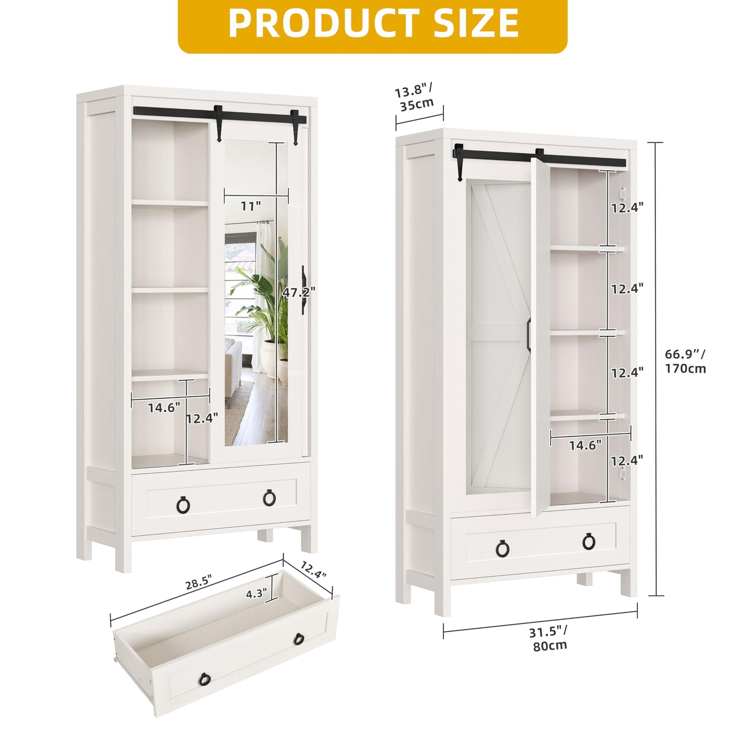 DWVO Bathroom Storage Cabinet, 67" Tall Storage Cabinet with Full Length Mirror & Barn Door, Farmhouse Bathroom Cabinets with Drawers for Kitchen Cabinet, Living Room, Laundry, White Oak