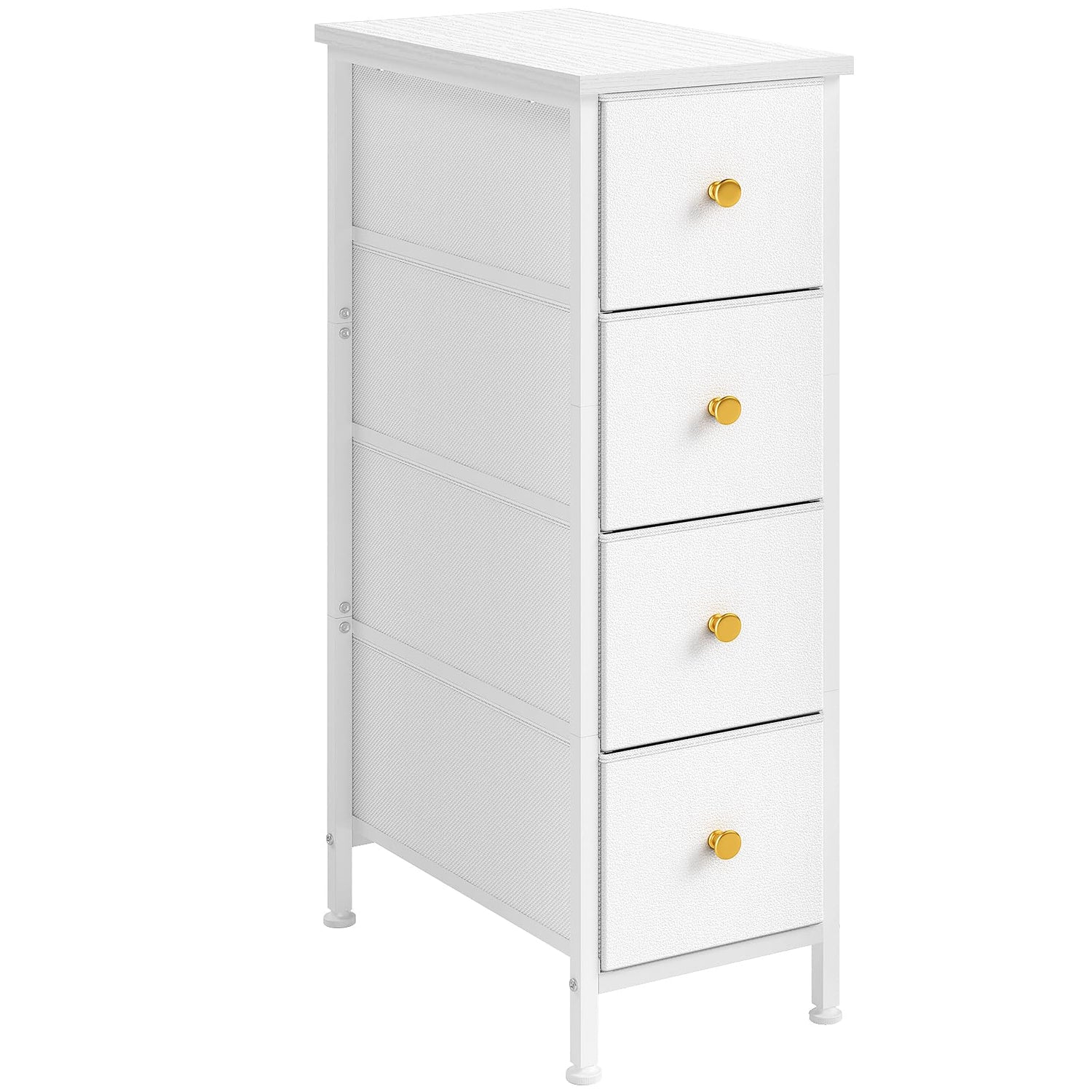 Fixwal Narrow Storage Cabinet, Dresser with 4 Drawers, Slim Fabric Dresser Storage Tower for Small Spaces, White Dresser with Steel Frame, Wood Top, for Bedroom, Bathroom, Living Room, Laundry, Closet