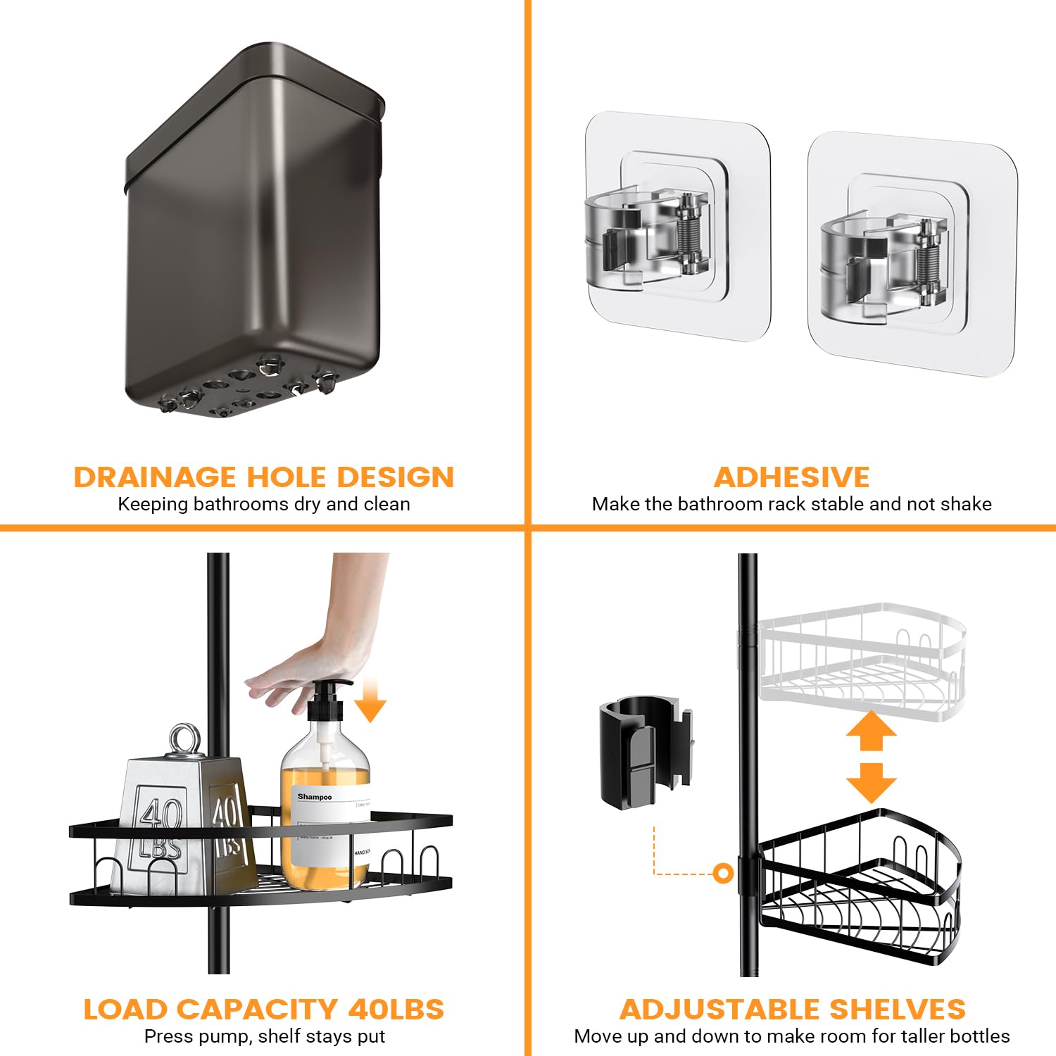 - STURDY, SECURE DESIGN – The four adjustable shelves allow you to set the perfect height for your needs. Thanks to the innovative buckle design, the friction surface is increased, preventing even heavy pump bottles from sliding off. The strong tension spring inside the pole ensures a secure fit against both the ceiling and floor, keeping the caddy steady and preventing shaking or falling. Two transparent buckles further stabilize the pole’s position.