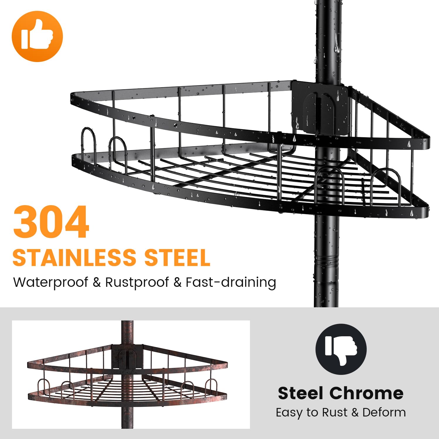- DURABLE STAINLESS STEEL CONSTRUCTION – Both the tension pole and shower rack are crafted from high-quality stainless steel, ensuring they won't rust, deform, or break. This material is perfect for wet environments like bathrooms and provides strong load-bearing capacity. The open-grid design of the shelves allows water to drain quickly, keeping your toiletries dry and your bathroom fresh.