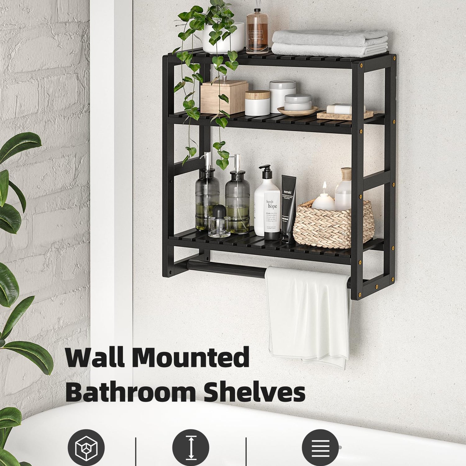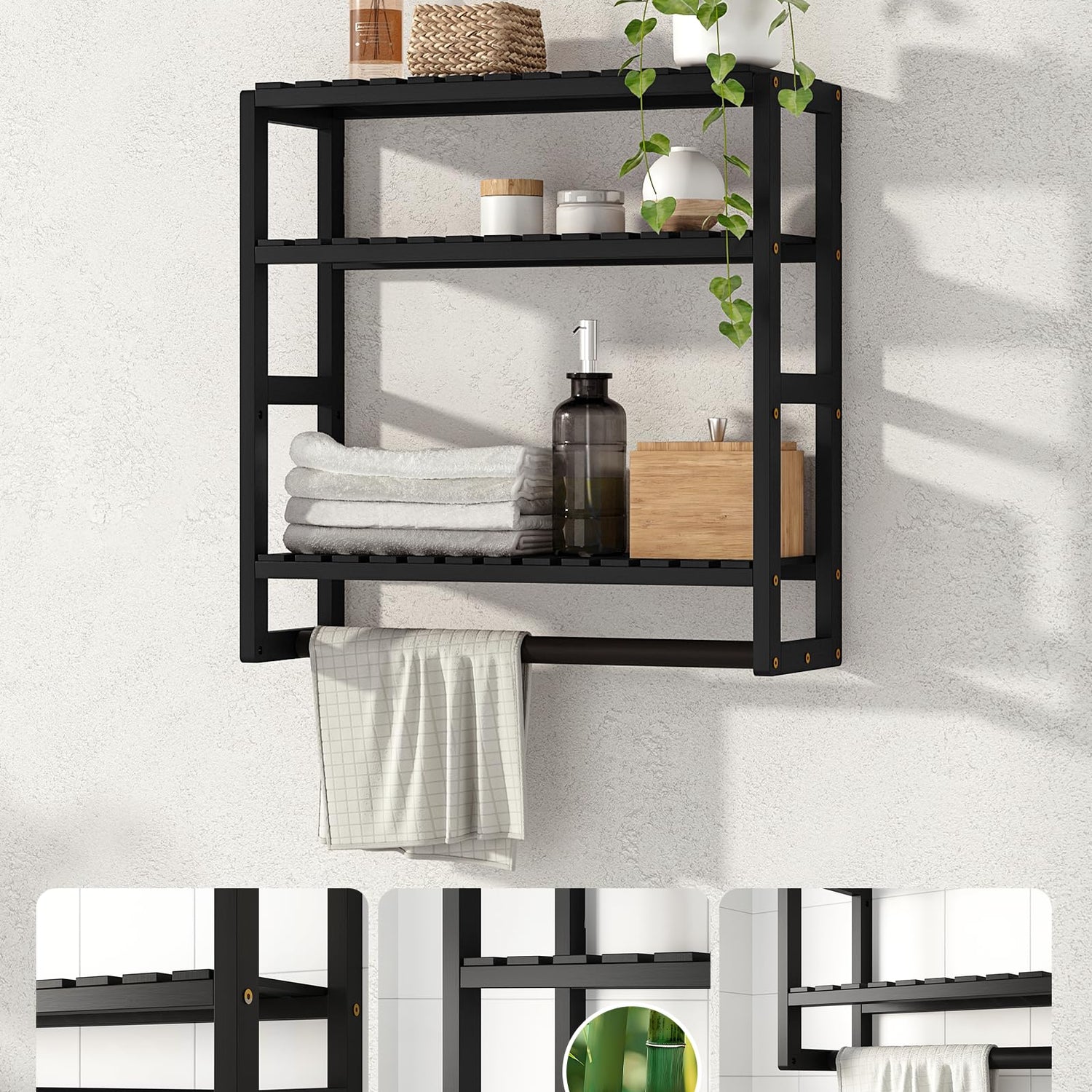 Galood Bathroom Shelves Towel Racks Over Toilet Storage with Towel Bar 3 Tier Floating Wall Mounted Space Saving Bamboo Paper Holder for Bathroom Laundry Room Kitchen Organizers (Black)