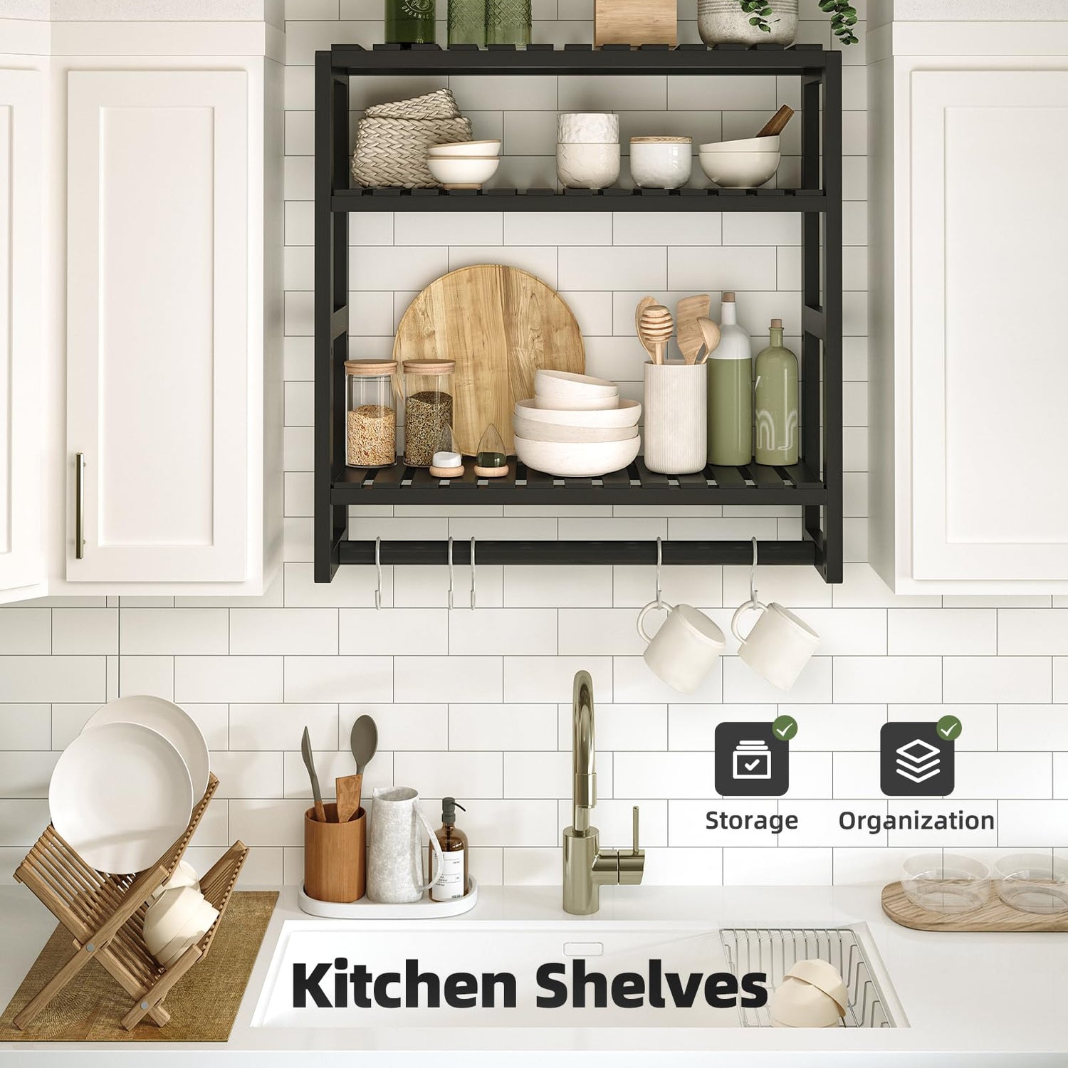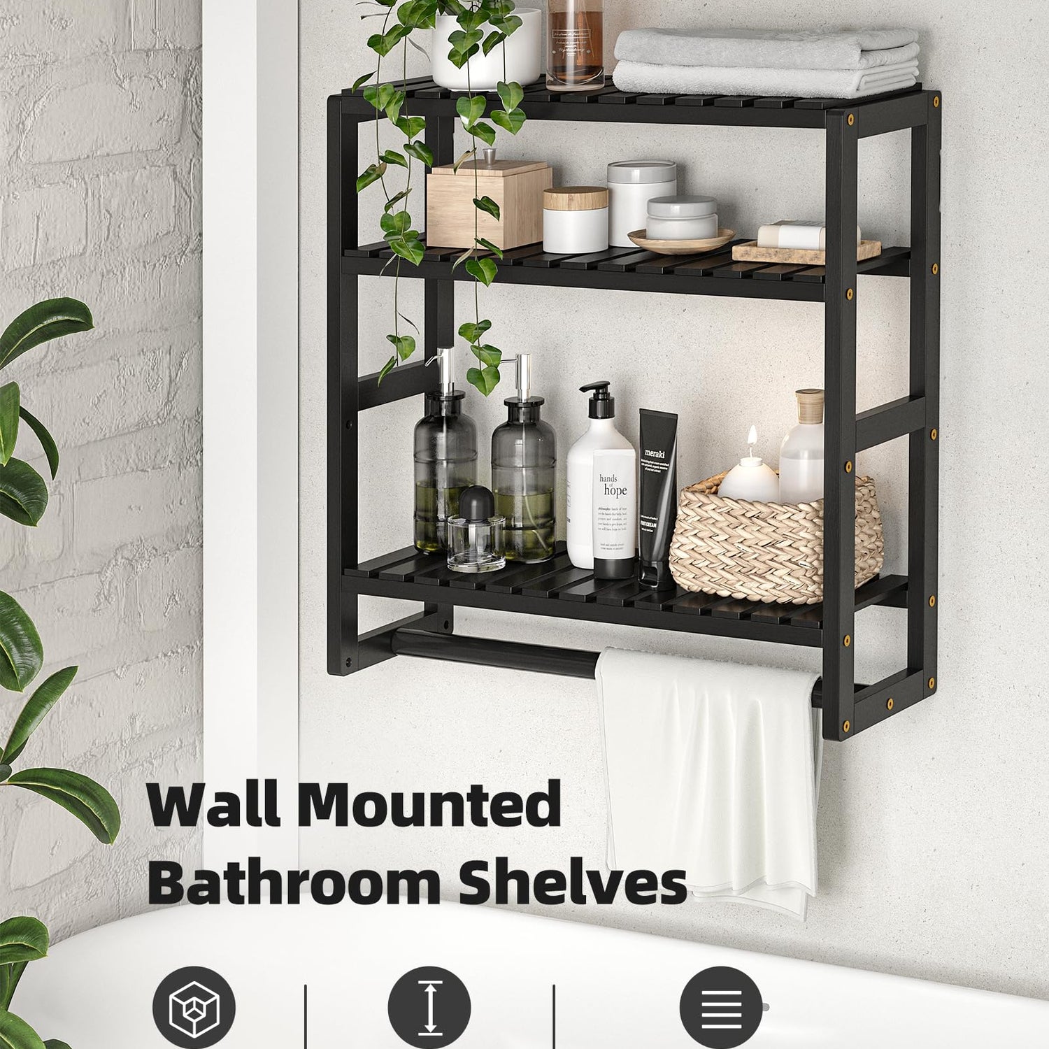Galood Over The Toilet Storage Bathroom Shelves Wall Mounted 3 Tier Space Saver Corner Shelf Organizer Bamboo Towel Rack Toilet Paper Cabinet with Hanging Rod Black